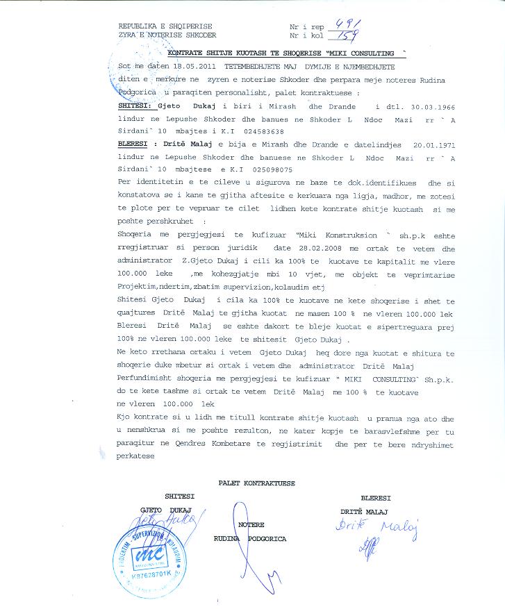 → Ekstrakti Historik i Regjistrit Tregtar date 21.10.2021 → Akti i themelimit te shoqerise → Kontrate shitje kuotash 18.05.2011 → Kontrate e Shitjes se Kuotave date 19.05.2021 → Ekstrakti Historik i Regjistrit Tregtar date 13.06.2025 |