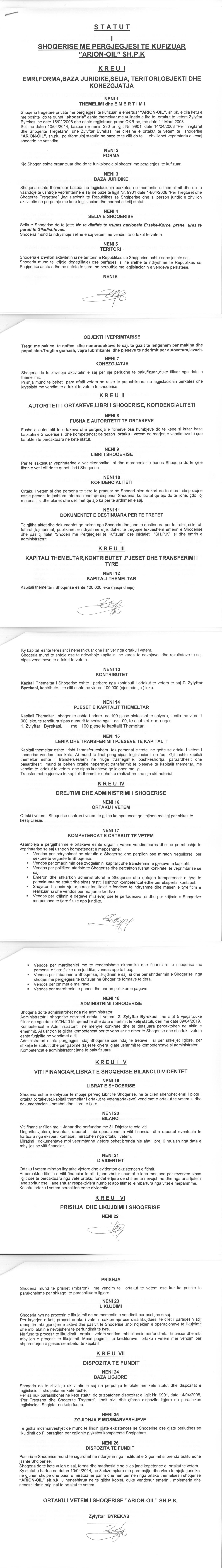 | Çështje Ligjore: | 24.01.207 Numri i ceshtjes: CN-122796-01-17 Arsyet e hapjes se ceshtjes: Depozitimi i Urdhrit Nr.667/4 Regj, datë 16.01.2017, protokolluar nga QKB me Nr.830 Prot, datë 20.01.2017,"Për Vënien e Sekuestros Konservative", lëshuar nga Përmbaruesi Gjyqësor Privat Dionis Mekshaj, ku është urdhëruar: Vendosjen e sekuestros konservative mbi aksionet që zotëron debitori subjekti, "Arion-Oil" shpk me NIPT K87711002J. |