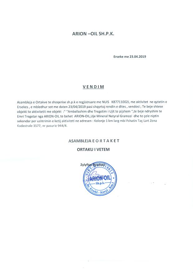 | Emërtime të tjera Tregtare: | ARION-OIL,Uje Mineral Natyral Gramozi. |