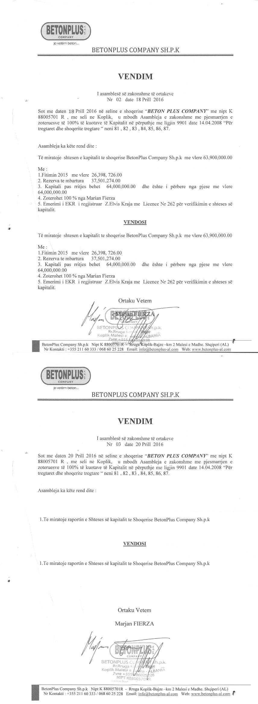 → Ekstrakti Historik i Regjistrit Tregtar date 29.10.2021 → Akti i themelimit te Shoqerise → Kontrate e Shitjes se Kuotave date 13.11.2014 → Vendim i Asamblese se Pergjithshme per rritjen e kapitalit date 18.04.2016 |