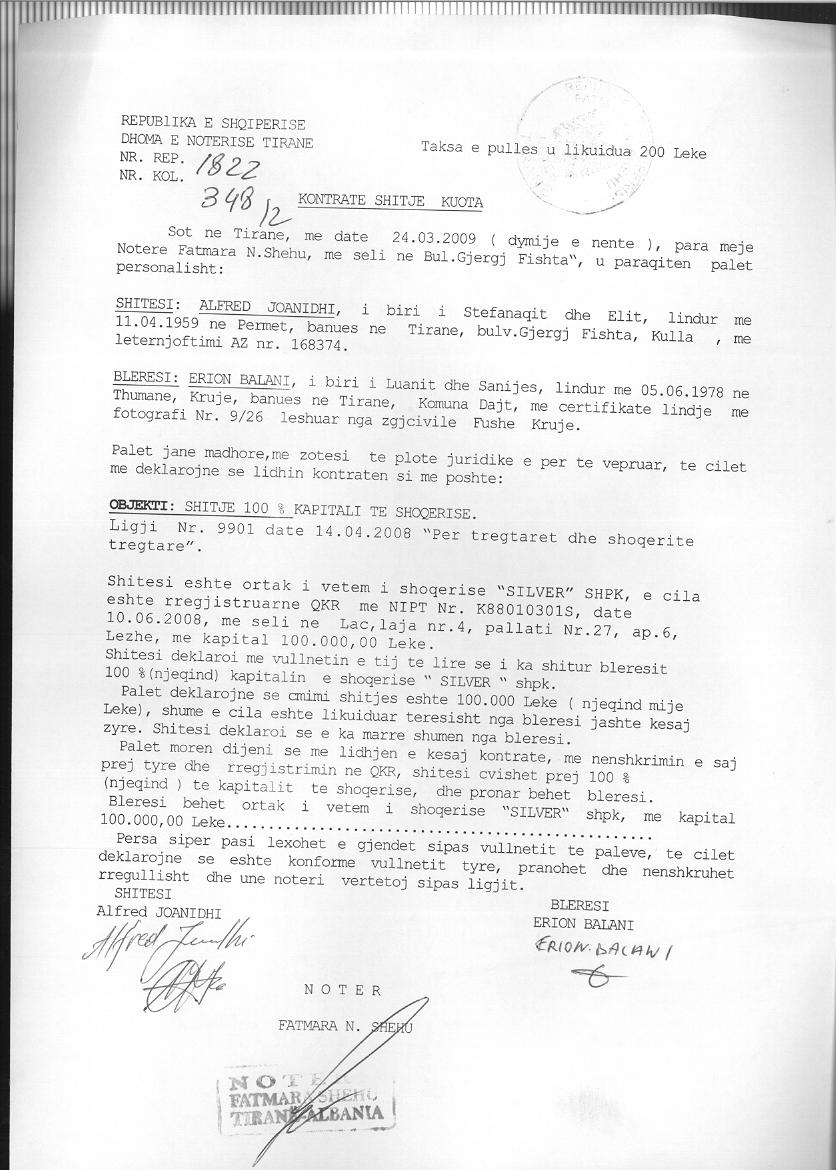 → Ekstrakt historik i regjistrit tregtar date 25.08.2021 → Akti i themelimit → Kontrate shitje kuotash date 16.10.2013 → Kontrate shitje kuotash date 13.01.2012 → Kontrate shitje kuotash date 24.03.2009 → Ekstrakt Historik i Regjistrit Tregtar date 05.09.2024 |