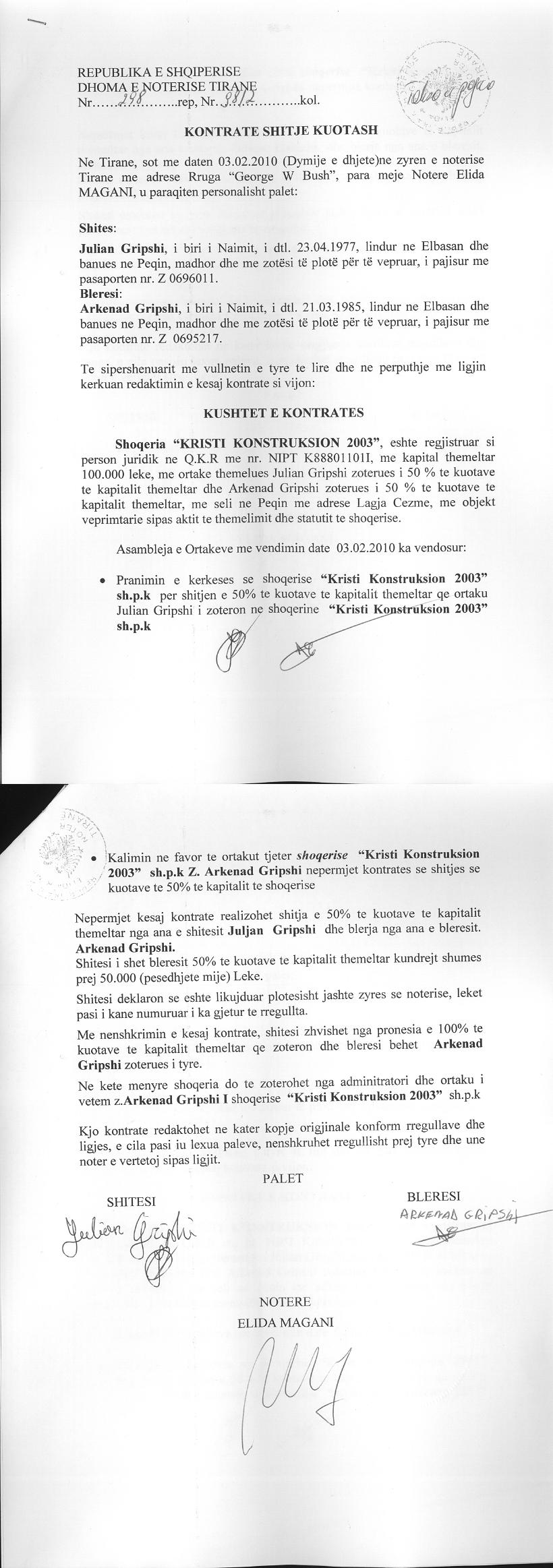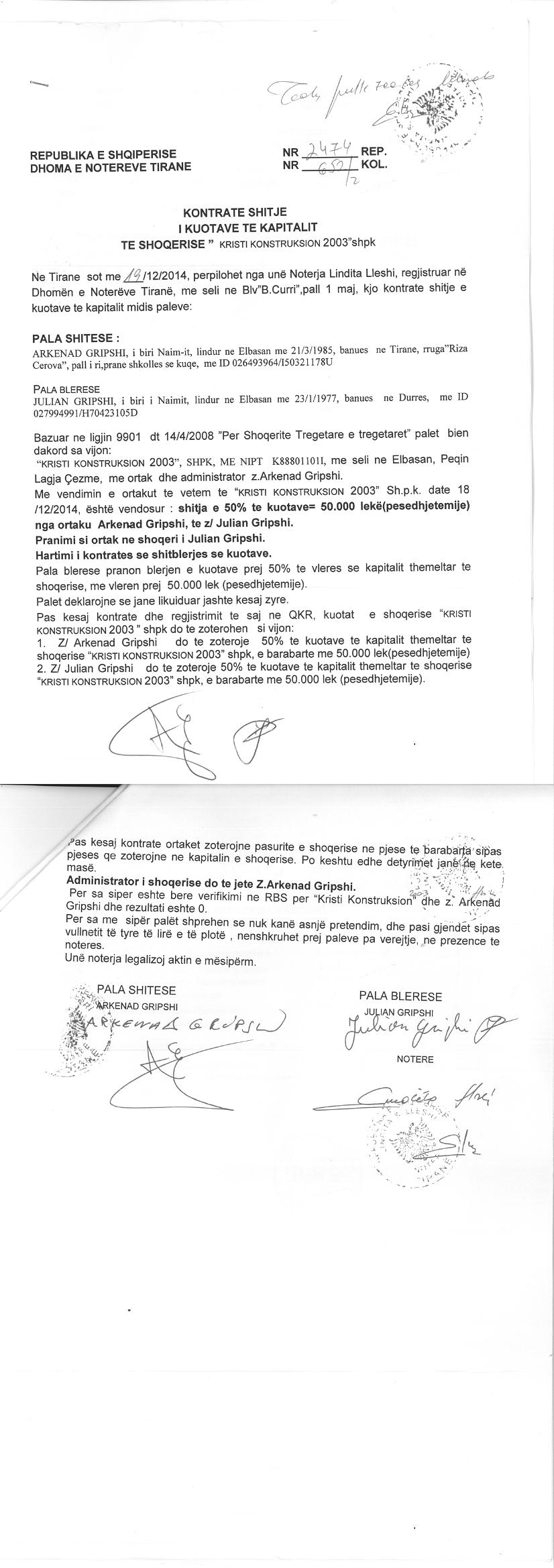 → Ekstrakt historik i regjistrit tregtar 13.12.2019 → Akti i themelimit → Kontrate shitje kuotash 03.02.2010 → Kontrate shitje te kuotave te kapitalit 19.12.2014 |