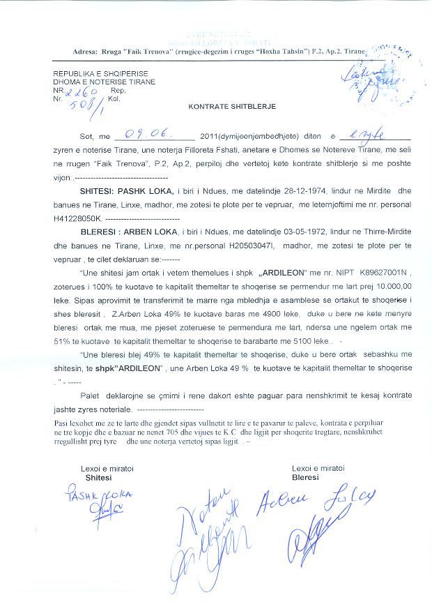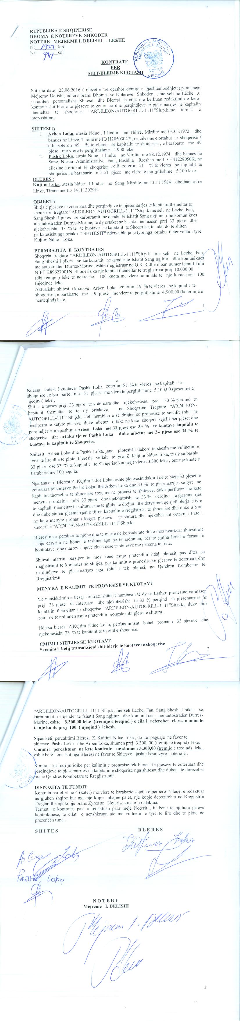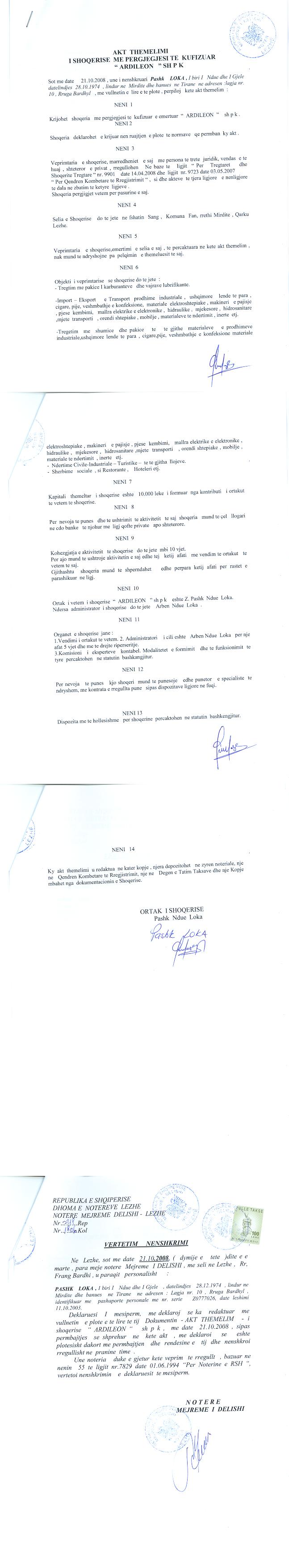 → Ekstrakti Historik i Regjistrit Tregtar date 28.08.2024 → Akti i themelimit te Shoqerise → Urdher per venien e sekuestros konservative date 08.03.2021 → Kerkese per vendosjen e mases se sigurimit te detyrimit tatimor date 31.08.2023 → Kerkese per vendosjen e mases se sigurimit te detyrimit tatimor date 26.03.2024 → Kontrate e Shitblerjes se kuotave date 09.06.2011 → Kontrate e Shitblerjes se kuotave date 23.06.2016 |