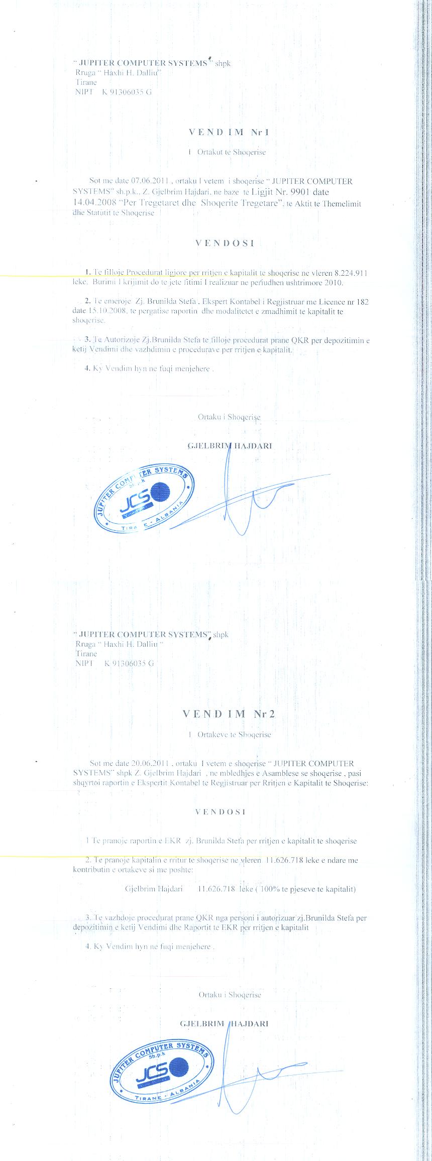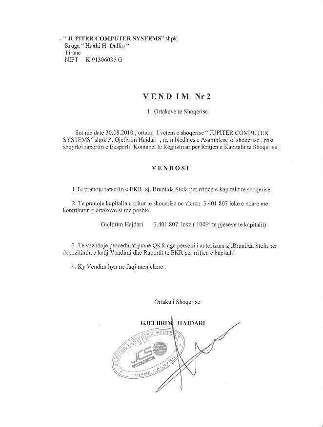 → Ekstrakt historik i regjistrit tregtar 21.10.2021 → Akti i themelimit → Vendimi i ortakut per rritjen e kapitalit 07.06.2011 → Vendimi i ortakut te vetem per rritjen e kapitalit 30.08.2010 → Vendim i ortakut te shoqerise per rritjen e kapitalit 08.12.2018 → Vendimi i ortakut te shoqerise per rritjen e kapitalit 18.08.2015 → Ekstrakt Historik i Regjistrit Tregtar date 19.05.2023 |