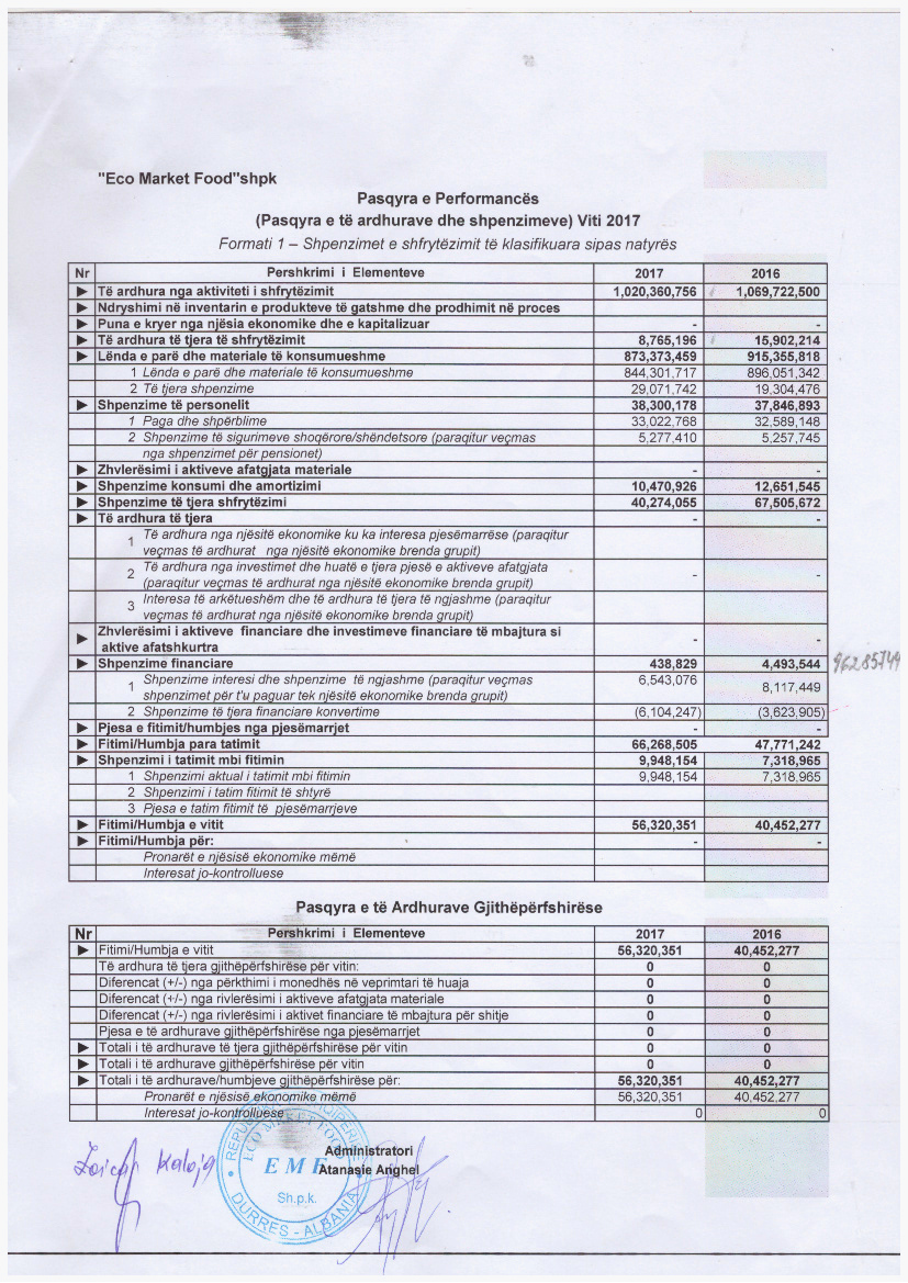 Xhiro Vjetore(Lekë) 2021:3 151 492 537,00 Xhiro Vjetore(Lekë) 2020:2 467 125 739,00 Xhiro Vjetore(Lekë) 2019:2 171 513 705,00 Xhiro Vjetore(Lekë) 2018:2 233 520 542,00 Xhiro Vjetore(Lekë) 2017:1 029 125 952,00 Xhiro Vjetore(Lekë) 2016:1 085 624 714,00 Xhiro Vjetore(Lekë) 2015:1 310 679 436,00 Xhiro Vjetore(Lekë) 2014: 1 602 235 739,00 Xhiro Vjetore(Lekë) 2013: 1 128 572 214,00 Xhiro Vjetore(Lekë) 2011: 870 656 010,00 Xhiro Vjetore(Lekë) 2010: 802 319 224,00 |