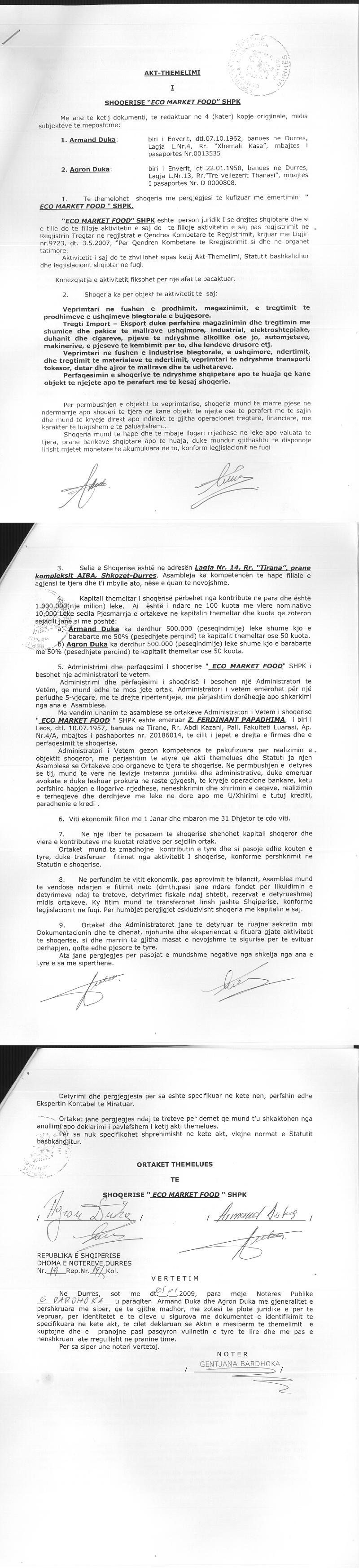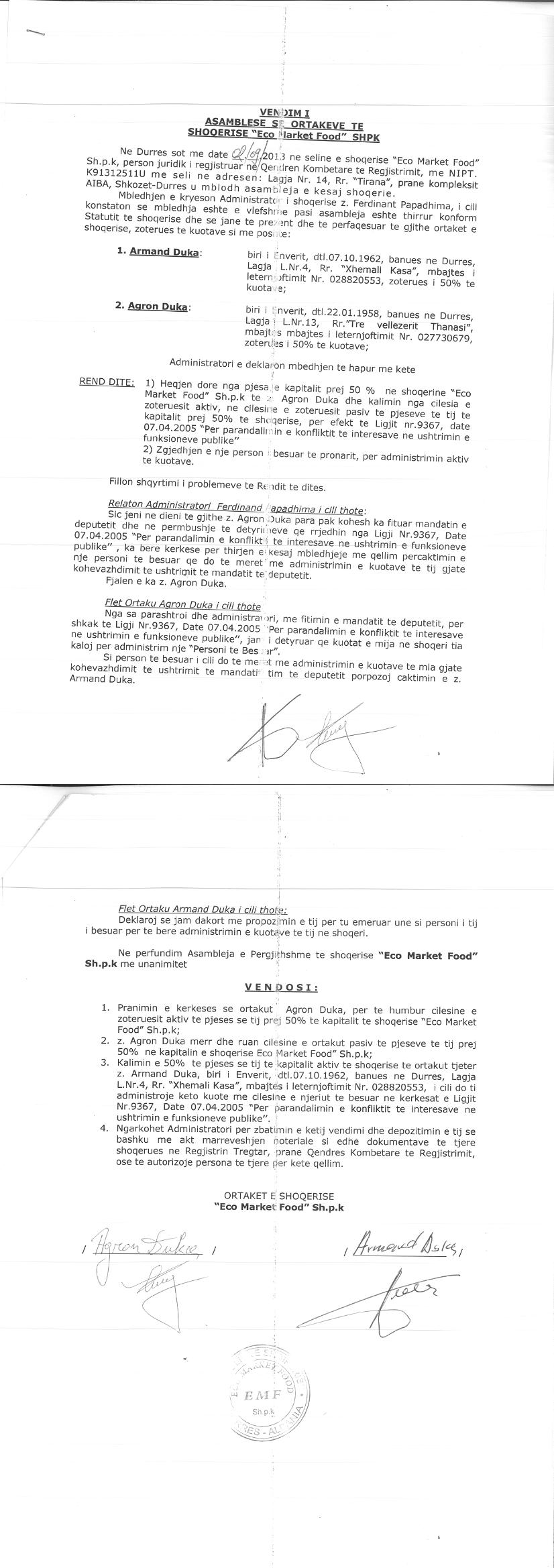 → Ekstrakti Historik i Regjistrit Tregtar date 30.05.2022 → Akti i themelimit te Shoqerise → Vendimi i Asamblese se Pergjithshme date 16.06.2011 → Vendimi i Asamblese se Pergjithshme date 04.06.2012 → Vendimi i Asamblese se Pergjithshme date 28.06.2013 → Vendimi i asamblesë se përgjithshme date 05.09.2013 → Vendimi i Asamblese se Pergjithshme date 30.06.2014 → Vendimi i Asamblese se Pergjithshme date 19.12.2014 → Vendimi i Asamblese se Pergjithshme date 30.06.2015 → Vendimi i Asamblese se Pergjithshme date 08.07.2016, → Vendimi i Asamblese se Pergjithshme date 30.06.2017 → Revokimi i Akt Marrveshjes date 08.04.2019 → Kontrate Hipotekimi date 20.02.2019 → Kontrate Pengu date 20.12.2019 → Kontatrate Pengu date 27.02.2021 → Akt Marreveshje date 25.09.2021 → Ekstrakt historik i regjistrit tregtar date 27.11.2023 |