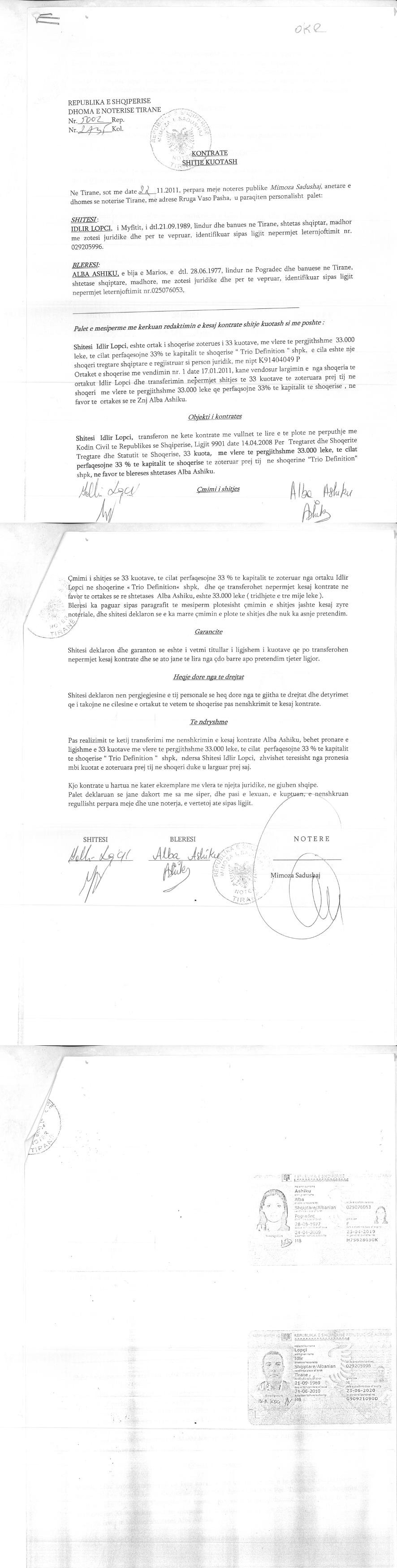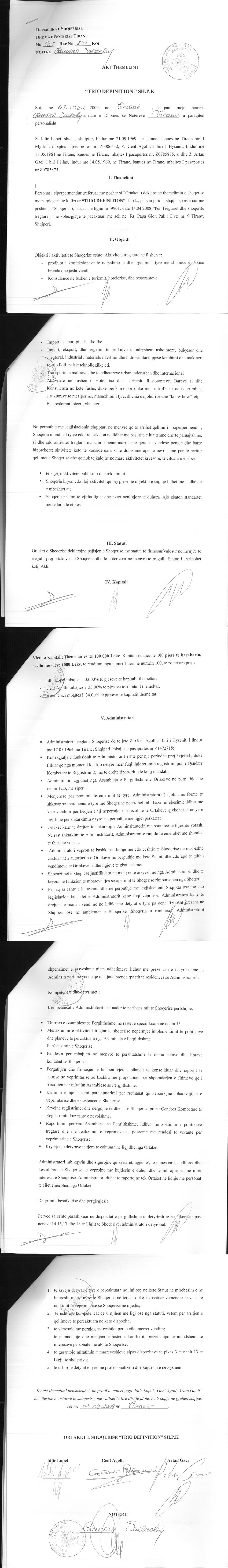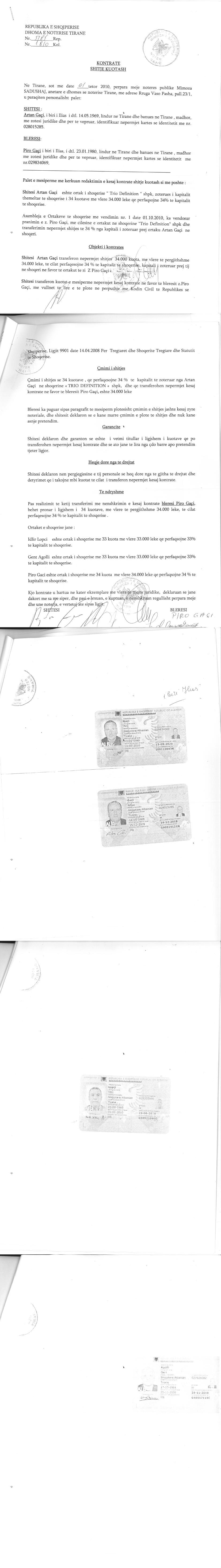 → Ekstrakti Historik i Regjistrit Tregtar date 18.03.2022 → Akti i themelimit te Shoqerise → Kontrate e shitjes se kuotave date 01.10.2010 → Kontrate se shitjes se kuotave date 22.11.2011 → Kontrate e shitjes se kuotave date 27.01.2012 → Kontrate e shitjes se kuotave date 19.03.2012 → Urdher per vendosjen e mases se sekuestros konservative date 28.03.2012 |