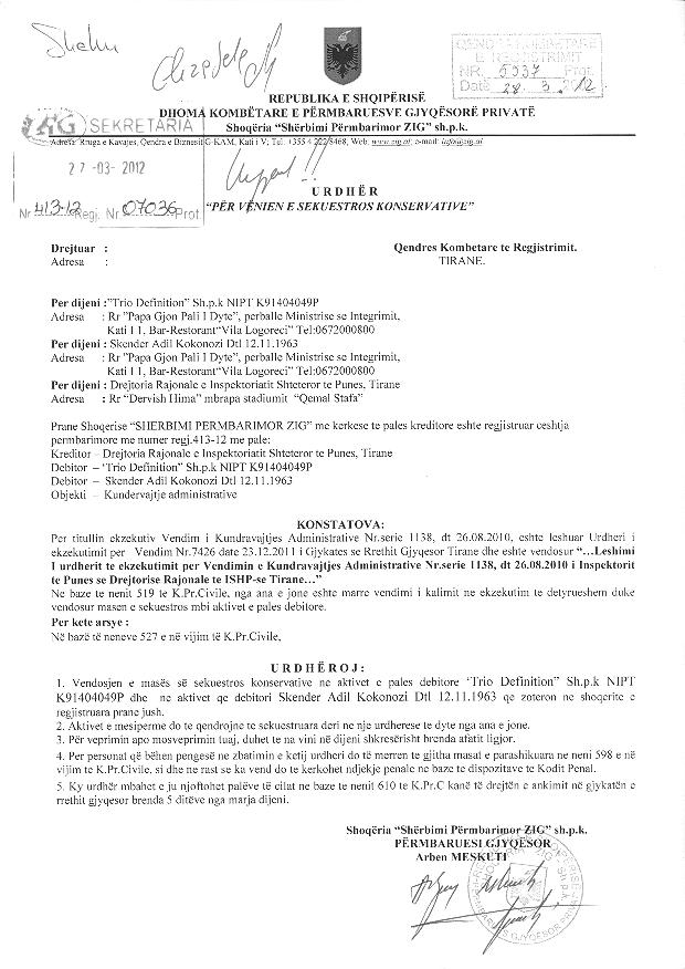 | Çështje Ligjore: | I.Me date 28.03.2012, eshte depozituar urdheri Nr.413-12 Regj. Nr.07036 Prot, lëshuar nga Shoqëria “Shërbimi Përmbarimor ZIG ” sh.p.k., ku është urdhëruar: Vendosja e masës së sekuestros konservative në aktivet e pales debitore shoqeria “TRIO DEFINITION" shpk, me NUIS(NIPT) K91404049P, si dhe ne aktivet e debitorit Z. Skënder Kokonozi, që zotëron në shoqërinë “TRIO DEFINITION" shpk. Aktivet e mësipërme do të qëndrojnë të sekuestruara deri në një urdhëresë të dytë. II. Sipas Vendimit te Asamblese se Pergjithshme date 16.01.2013, eshte ndryshuar statusi i shoqerise nga aktiv ne te pezulluar. III. Me date 31.10.2014, eshte depozituar urdheri Nr. 25951 Prot, leshuar nga shoqeria "Sherbimi Permbarimor ZIG" sh.p.k, per heqjen e sekuestros konservative nga aktivet e pales debitore, shoqeria "Trio Definition" sh.p.k me NUIS (NIPT) - K91404049P, vendosur me ane te shkreses nr. prot. 07036 date 28.03.2012. IV.Me date 16.12.2015, eshte depozituar kerkesa për vendosje barre sigurie mbi titujt e pronësisë Nr. 12998/2 Prot., lëshuar nga Drejtoria Rajonale Tatimore Tiranë ku është kërkuar : Të mos lejohen të kryhen tjetërsime mbi titujt e pronësisë për tatimpaguesin, subjektin "Trio Definition” shpk, me NUIS (NIPT) K91404049P, me administrator Aulent Shaba. |