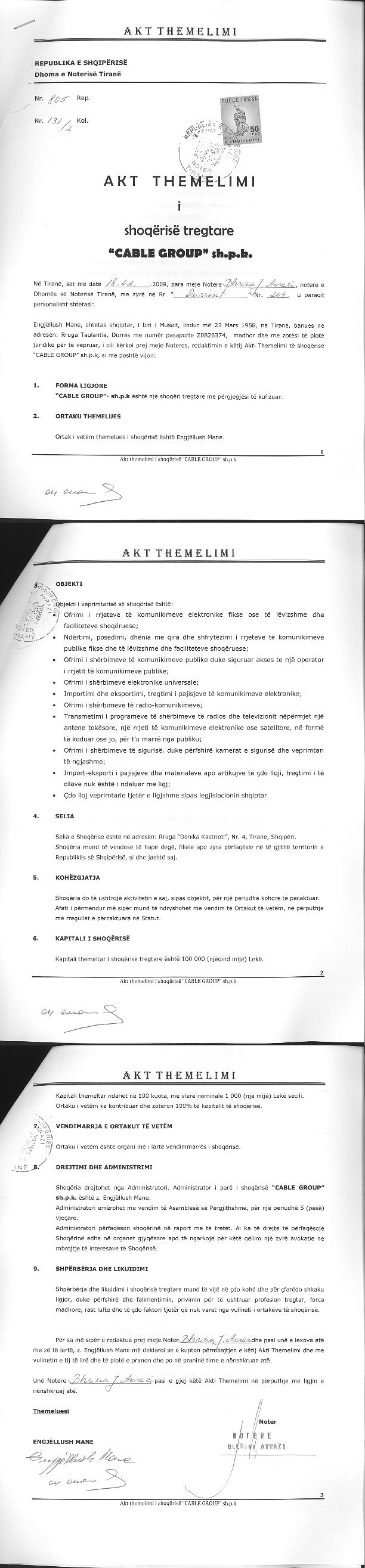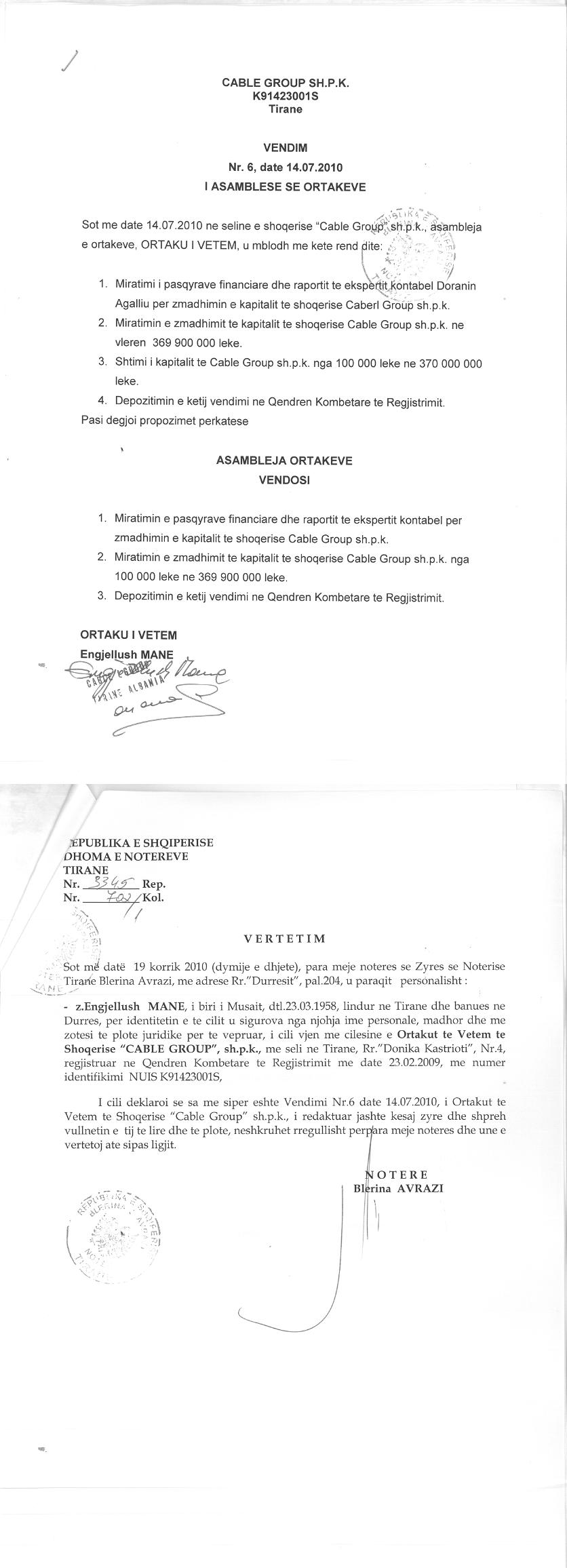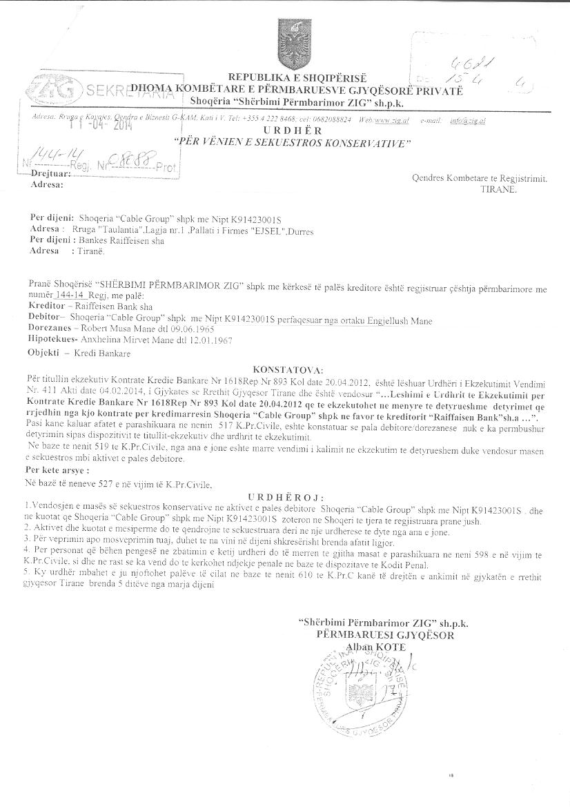 → Ekstrakti Historik i Regjistrit Tregtar date 16.08.2022 → Akt themelimi i Shoqerise → Vendim i Ortakut te Vetem, Zmadhim Kapitali date 14.07.2010 → Urdher per Venie Sekuestro date 25.07.2012 → Urdher per Heqje Sekuestro date 18.02.2013 → Vendim 20.04.2014 → Urdher per Venie Sekuestro date 10.04.2014 → Urdher per Venie Sekuestro date 11.04.2014 → Urdher per Venie Sekuestro date 11.04.2014 → Urdher per Heqje Sekuestro date 22.05.2017 |