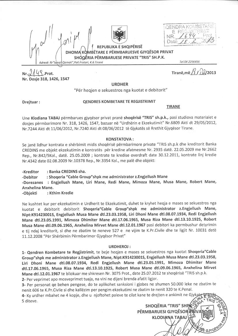 | Çështje Ligjore: | I. Me date 25.07.2012, me ane te Urdhrit Nr.3075 Prot. Nr.318 Dosje, lëshuar nga Shoqëria Permbaruese Private ''TRIS'' sh.p.k, u urdherua vendosja e sekuestros konservative mbi kuotat e shoqerise ''Cable Group'' shpk, me NUIS(NIPT) K91423001S. II. Me datë 18.02.2013, me ane te Urdhrit Nr.2149 Prot., Nr.Dosje 318,1426,1547, lëshuar nga Shoqëria Përmbaruese Private “TRIS” sh.p.k., u kerkua heqja e mases se sekuestros nga kuotat shoqeria ” CABLE GROUP” sh.p.k, me administrator z. Engjellush Mane, me NUIS(NIPT) – K91423001S, te bllokuar me shkresen Nr. 3075 Prot, date 25.07.2012. III. Depozitimi i Vendimit te Gjykates se Rrethit Gjyqesor Tirane, Nr. 7272 Regj. Them, date: 13.01.2013; Nr. 1422 Vendimi, date: 03.02.2014, me te cilin u vendos pranimi i kerkese - padise. Zgjidhja e Marreveshjes se Ortakeve dt. 29.07.2010, midis "Cable Group" Shpk dhe Elton Bakalli e Erdgen Bakalli. Prishja e ortakerise "Cable Group" Shpk. IV. Me date 10.04.2014, me ane te Urdhrave Nr. 146-13 Regj., Nr. 07903 Prot., dhe urdhrit Nr.145-14 regj., Nr. 07908 Prot., "Për Vënien e Sekuestros Konservative”, lëshuar nga Shoqëria “Shërbimi Përmbarimor ZIG” sh.p.k., drejtuar QKR, u urdherua vendosja e masës së sekuestros konservative në aktivet e palës debitore Shoqëria “Cable Group” sh.p.k.,me NUIS(NIPT)-K91423001S, si dhe në kuotat që dorëzanësi Engjëllush Mane, zotëron në Shoqërinë “Cable Group” sh.p.k. Aktivet dhe kuotat e mësipërme do të qëndrojnë të sekuestruara deri në një urdhëresë të dytë”. V. Me datë 11.04.2014, me ane te Urdhrit Nr.143/10 Prot., lëshuar nga Studio Ligjore Sherbim Permbarimi Gjyqesor Eduard Allamani, u urdherua vendosja e masës së sekuestros konservative mbi subjektin juridik shoqeria "Cable Group" sh.p.k me NUIS (NIPT) K91423001S me administrator Engjellush Mane.Ne ekzekutim te vendimit gjyqesor beni vendosjen e mases se sekuestros konservative,duke bllokuar tjetersimin e aksioneve,kuotave etj te subjektit juridik shoqeria " "Cable Group" sh.p.k me NUIS (NIPT) K91423001S me administrator Engjellush Mane deri në një urdhër të dytë te permbaruesit gjyqesor,per te bere te mundur vjeljen e detyrimit". VI. Me date 11.04.2014, me ane te Urdhrit Nr.144-14 Regj., Nr. 08088 Prot., lëshuar nga shoqëria "Shërbimi Përmbarimor ZIG" sh.p.k, për vendosjen e masës së sekuestros konservative në aktivet e palës debitore Shoqëria 'Cable Group'sh.p.k me Nipt- K91423001S. Aktivet dhe kuotat e mësipërme do të qëndrojnë të sekuestruara deri në një urdhëresë të dytë. VII. Depozitimi i Kërkesës për Vendosje Barre Sigurie mbi titujt e pronësisë Nr. 12925/2 Prot., datë 13.12.2015, lëshuar nga Drejtoria Rajonale Tatimore Tiranë u kerkua të mos lejohet tjetërsimi I titujve të pronësisë përfshi edhe shitblerje aksionesh të subjektit " CABLE GROUP " ,pajisur me NUIS (NIPT)- K91423001S, deri në shlyerjen e detyrimeve tatimore nga ana e tatimpaguesit debitorë. VIII. Me date 19.05.2015, me ane te Urdhrit Nr.755/5 Prot., Nr.755 Regj., "Per Venien e Sekuestros Konservative”, leshuar nga Shoqeria Permbarimore “Jus” drejtuar QKR-se, u urdherua vendosja e mases se sekuestros konservative mbi kuotat dhe e te drejtave qe rrjedhin nga zoterimi i kuotave per shumen 29,932,152 leke ku eshte perfshire edhe tarifa e plote e sherbimit permbarimor. IX. Me date 23.11.2015, me ane te Urdhërit Nr.197/7 Prot,Nr.197 Regj., protokolluar nga QKR me Nr. 10609 Prot., date 23.11.2015 "Për Vendosjen e Sekuestros Konservative”, lëshuar nga Shoqëria Përmbarimore"SPEED SOLUTION", drejtuar QKR, u kerkua vendosja e sekuestros konservative mbi aktivet e shoqerise: “Cable Group” sh.p.k., me NIPT-K91423001S me administrator Engjellush Mane. X. Me date 22.05.2017, me ane te Urdhërit Nr.197/125 Prot, Nr.197 Regj., protokolluar nga QKB me Nr. 7515 Prot., date 23.05.2017 "Për Heqjen e Sekuestros Konservative”, lëshuar nga Shoqëria Përmbarimore"SPEED SOLUTION", drejtuar QKB, u urdherua vendosja e mases se sekuestros konservative mbi aktivet e debitorit shoqeria “Cable Group” sh.p.k., me NIPT-K91423001S me administrator Engjellush Mane, qe ka ne shoqeri te regjistruara prane jush, te bllokuar me ane te shkreses Nr.197/7PProt., date 23.11.2015 te permbaruesit gjyqesor. XI. Me datë 16.12.2021, me ane te Shkresës Nr. 17970 Prot., për Vendosjen e Masës së Sigurimit të Detyrimit Tatimor, lëshuar nga Drejtoria e Përgjithshme e Tatimeve, Rajoni Qëndror, u kerkua të mos lejohet tjetërsimi mbi pasurinë dhe të drejtat pasurore që i përkasin “CABLE GROUP” Shpk, me NUIS(NIPT)- K91423001S. |