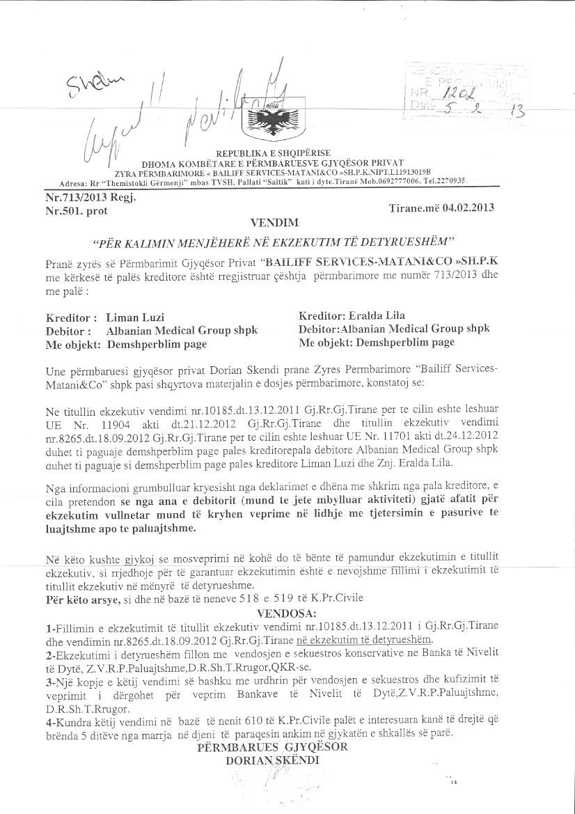 | Çështje Ligjore: | I.Sipas Vendimit te Asamblese se Pergjithshme date 06.02.2012, eshte ndryshuar statusi i shoqerise nga aktiv ne te pezulluar. II. Sipas Vendimit te Asamblese se Pergjithshme date 26.03.2012, eshte ndryshuar statusi i shoqerise nga i pezulluar ne aktiv. III.Me date 04.02.2013, eshte depozituar Urdhri Nr.502 Prot, lëshuar nga Zyra përmbarimore “Bailiff Services-Matani & CO” sh.p.k., ku është urdhëruar:" Vendosja e masës së sekuestros konservative mbi aksionet e palës debitore shoqërisë "ALBANIAN MEDICAL GROUP" sh.p.k., me NIPT-K91608005 E deri në një urdhër të dytë te permbaruesit gjyqesor".Depozitimi i shkreses Nr.501 Prot., datë 04.02.2013, lëshuar nga Zyra përmbarimore “Bailiff Services-Matani & CO” sh.p.k., ku është vendosur:" Fillimi i ekzekutimit te titullit ekzekutiv vendimi Nr.10185 dt.13.12.2011 i Gj.Rr.Gj.Tirane dhe vendimin Nr.8265 dt.18.09.2012 Gj.Rr.Gj.Tirane ne ekzekutim te detyrueshem.Ekzekutimi i detyrueshem fillon me vendosjen e sekuestros konservative ne Banka te Niveli te Dyte,Z.V.R.P Paluajtshme,D.R.Sh.T. Rrugor,QKR-se ". IV.Me date 15.08.2016, eshte depozituar urdhri Nr. 1526/9-0606-16 Prot. protokolluar nga QKB me Nr.6223 Prot., date 17.08.2016 leshuar nga shoqeria "Kodra Bailiff Service" sh.p.k, “Per Venien e sekuestros konservative” drejtuar QKB-se, ku eshte urdheruar:Vendosja e mases se sekuestros konservative ne kuotat e subjektit Albanian Medical Group me NUIS (NIPT) K91608005E, si dhe mbi te drejtat qe rrjedhin nga zoterimi i ketyre kuotave duke ndaluar tjetersimin dhe ose disponimin e tyre si dhe mos kryerjen e asnje veprimi tjeter i cili mund te ndryshoje te dhenat e regjistrit tregtar.Dokumentacioni do te qendroje i bllokuar deri ne nje urdher te dyte. Vendosjen e mases se sekuestros konservative ne te tjera aksione/kuota te cilat zoterohen nga pala debitore Albanian Medical Group me NUIS (NIPT) K91608005E ne shoqeri te tjera te regjistruara prane regjistrit tregtar. V.Me date 30.08.2021, eshte depozituar urdhri Nr. 1019/2 Prot, Urdhër për Vënien e Sekuestros Konservative", lëshuar nga Përmbaruesi Gjyqësor Privat Najada Beqaraj, protokolluar nga QKB me Nr. 10547 Prot, datë 01.09.2021, ku është urdhëruar: Vënien menjëherë të masës së sekuestros konservative në aktivitetet e palës debitore, shoqëria " ALBANIAN MEDICAL GROUP " SHPK me NUIS (NIPT) K91608005E. |