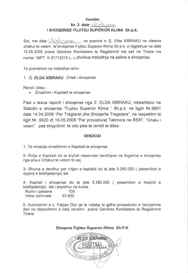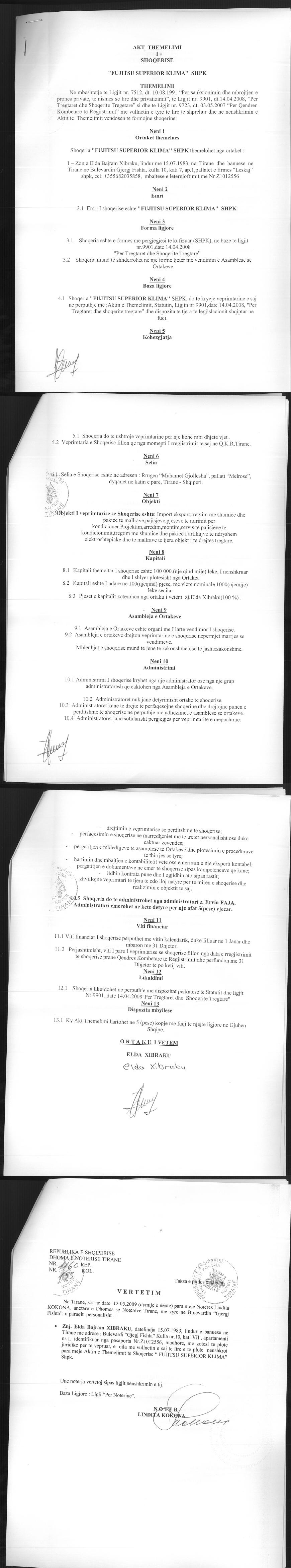 → Ekstrakt historik i regjistrit tregtar 27.08.2021 → Akti i themelimit → Vendimi per zmadhimin e kapitalit 21.12.2010 → Kontrate shitje te pjeseve te kapitalit themeltar 11.03.2015 → Kontrate shitje te pjeseve te kapitalit themeltar 22.12.2016 |