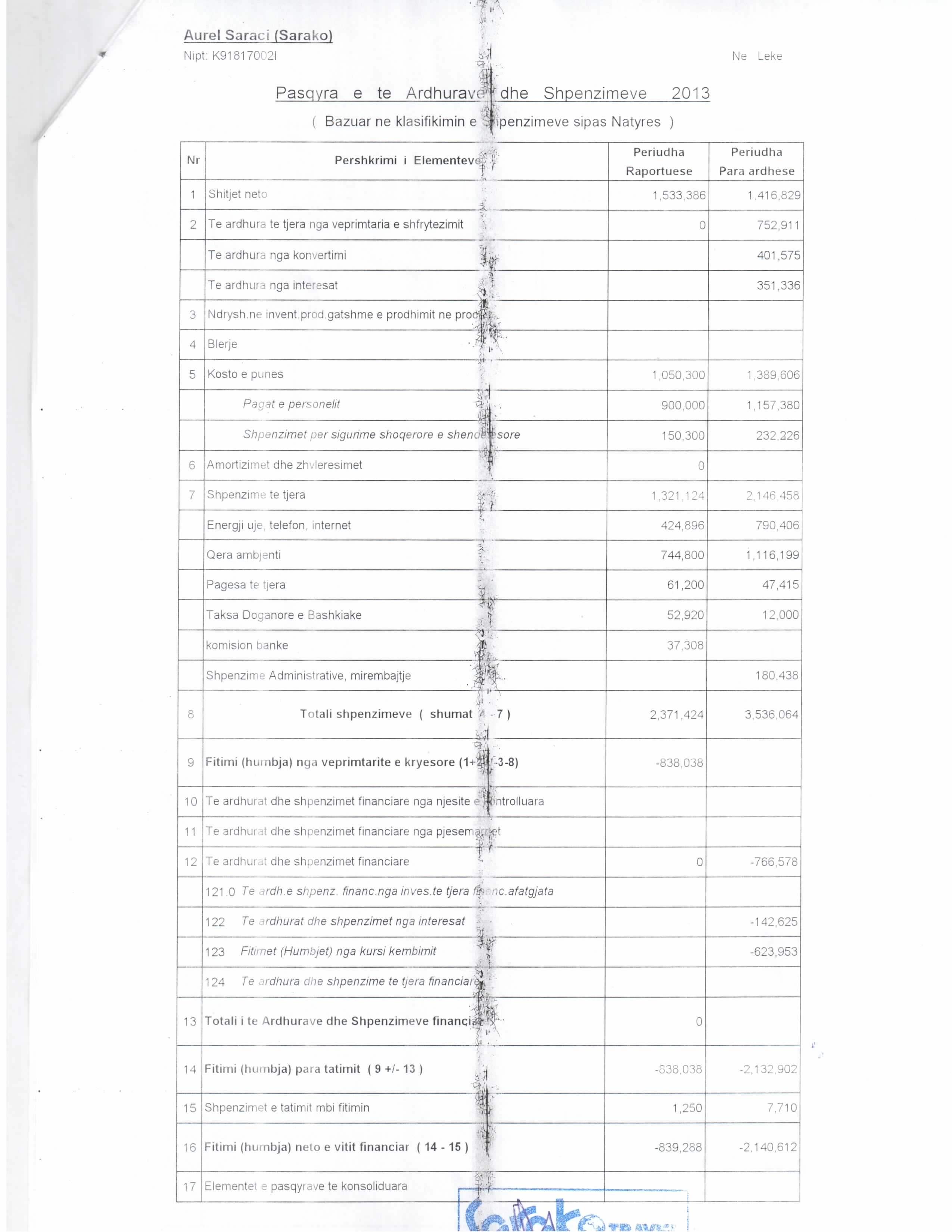 1 088 738,00 Fitimi para Tatimit(Lekë) 2019: 4 054 406,00 Fitimi para Tatimit(Lekë) 2018: 4 046 890,00 Fitimi para Tatimit(Lekë) 2017: 3 591 754,00 Fitimi para Tatimit(Lekë) 2016: 3 616 379,00 Fitimi para Tatimit(Lekë) 2015: 994 075,00 Fitimi para Tatimit(Lekë) 2013: -838 038,00 Fitimi para Tatimit(Lekë) 2012: -2 132 902,00 |