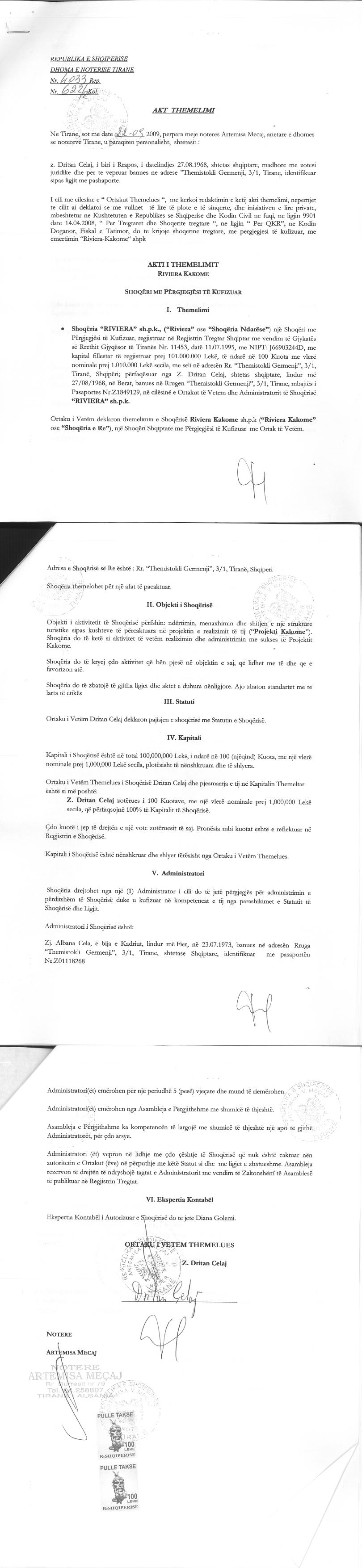 | Objekti i Veprimtarisë: | Ndertim, menaxhim dhe shitja e nje strukture turistike sipas kushteve te percaktuara ne projektin e realizimit te tij ("Projekti Kakome"). |