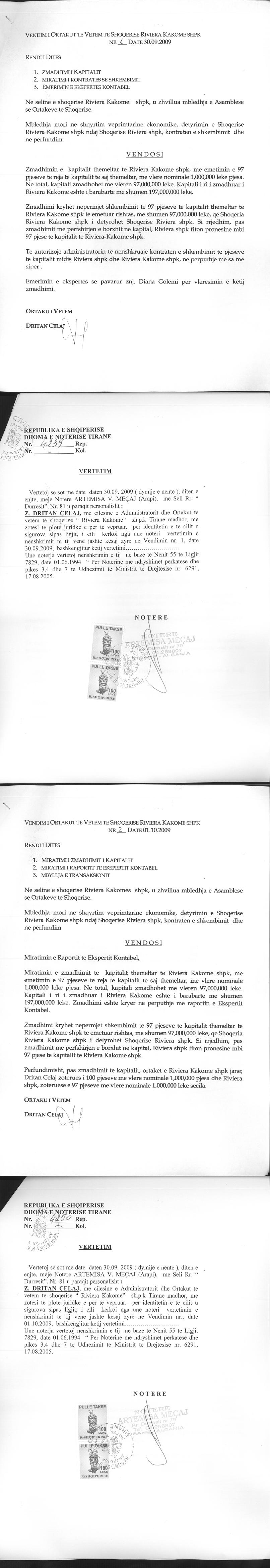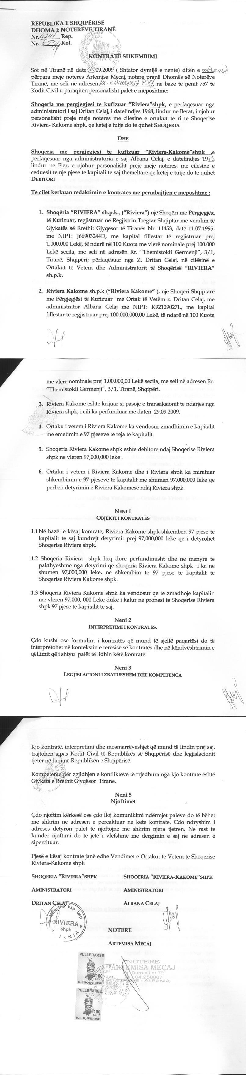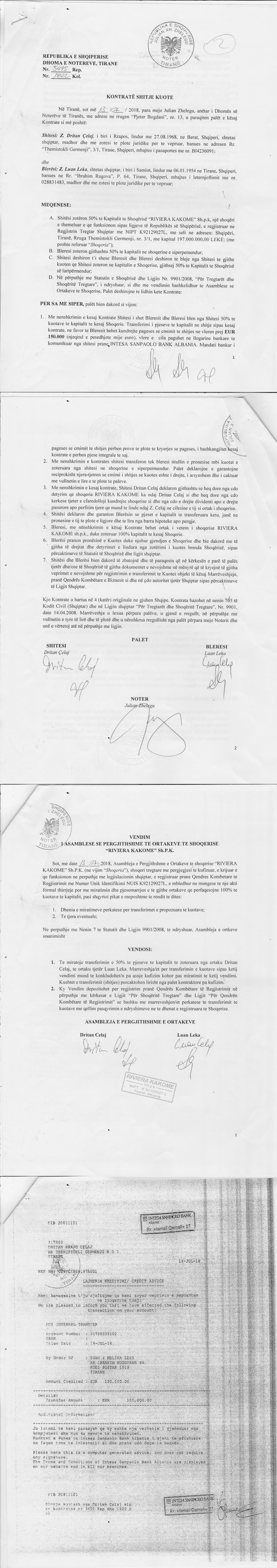 → Ekstrakt Historik i Regjistrit Tregtar date 01.10.2024 → Akt themelimi i Shoqerise → Vendim i Ortakut të Vetëm, Zmadhim Kapitali datë 30.09.2009 → Kontratë Shkëmbimi datë 30.09.2009 → Kontratë për Blerje dhe transferim kuotash datë 13.10.2009 → Kontratë për Blerje Kuotash datë 11.11.2010 → Kontratë për Blerje Kuotash datë 10.05.2013 → Kontratë Shitje Kuotash datë 13.07.2018 → Kontratë Shitblerje e Pjesëve të Kapitalit datë 03.03.2022 → Ekstrakt Historik i Regjistrit te Pronareve Perfitues date 01.10.2024 |