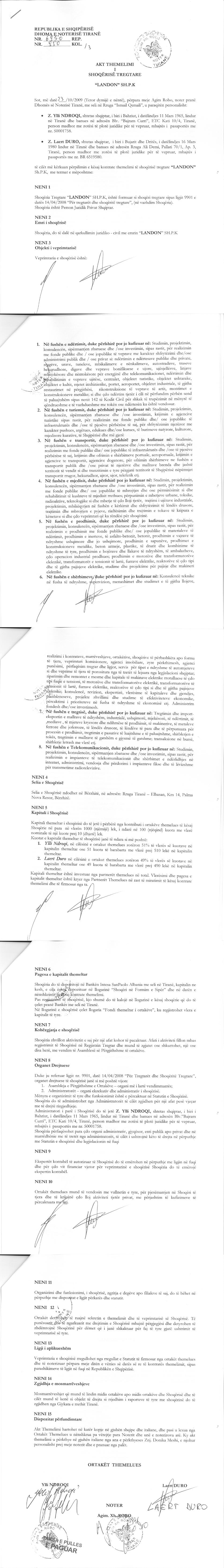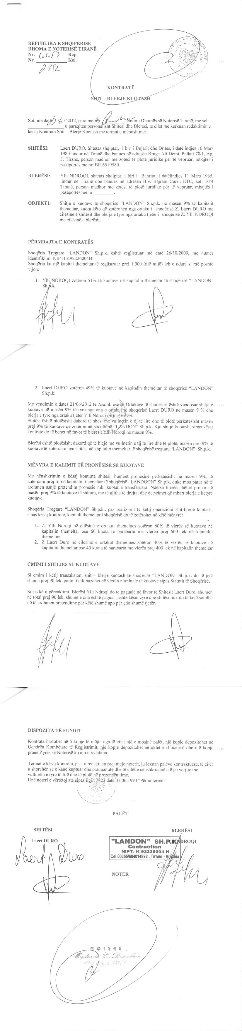 → Ekstrakt Historik i Regjistrit Tregtar date 10.04.2023 → Akt themelimi i Shoqerise → Kontratë Shitblerje Kuotash datë 21.06.2012 → Vendimi i Gjykatës së Posacme të Shkallës së Parë për Korrupsionin dhe Krimin e Organizuar Tiranë, Nr.17 datë 03.11.2022 → Urdhër Ekzekutimi i Vendimit Penal Nr.17 datë 03.11.2022 |
