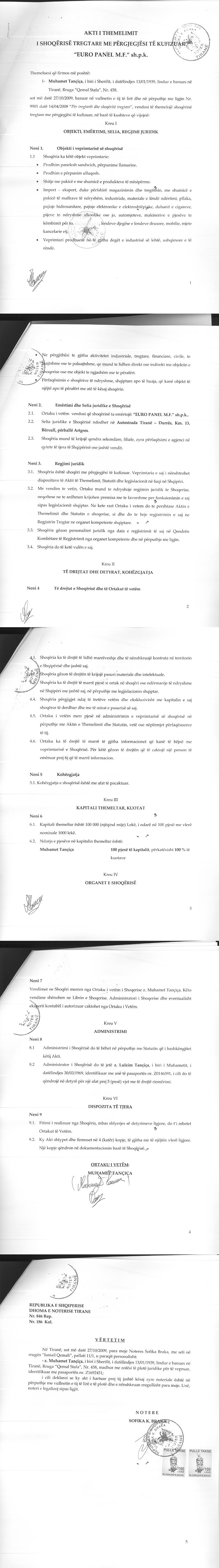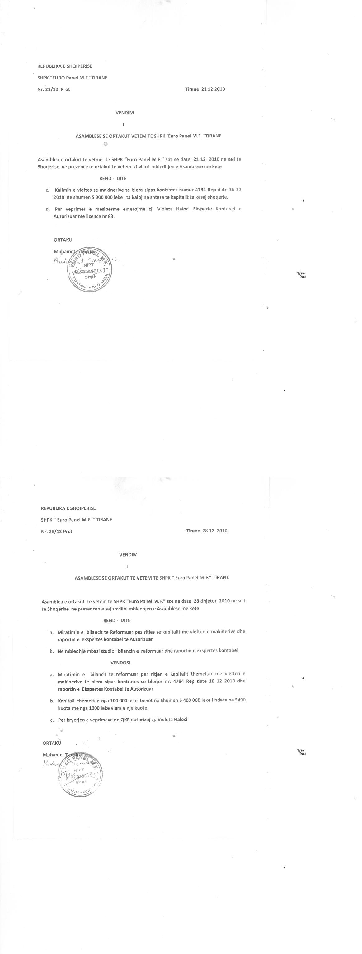 → Ekstrakt Historik i Regjistrit Tregtar date 19.05.2023 → Akt themelimi i Shoqerise → Vendim i Asamblesë së Ortakut të Vetëm, Zmadhim Kapitali datë 21.12.2010 → Urdhër për Vendosjen e Sekuestros datë 31.10.2022 → Urdhër për Heqjen e Sekuestros datë 12.12.2022 |