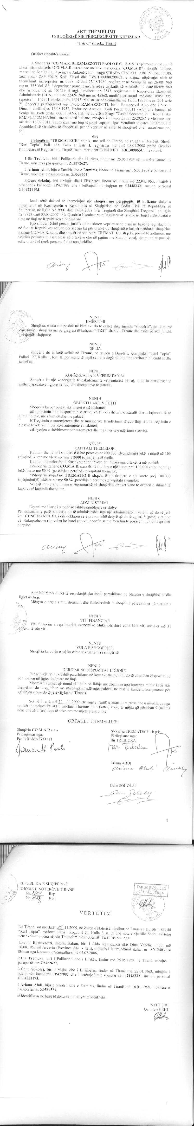 | Shoqëri Mëmë / Zotërues për këtë Subjekt: | CO.M.A.R DI RAMAZZOTTI PAOLO E C. S.A.S, shoqëri italiane e themeluar sipas ligjeve të shtetit italian, me seli në Senigallia, Provinca e Ankonës, Itali, rruga STRADA STATALE ARCEVIESE. 15/BIS, kodi postar CAP 60019, Kodi Fiskal dhe TVSH 00080200421, e krijuar nëpërmjet aktit të themelimit me repertor nr.5097 më datë 25.08.1960, regjistruar në Senigallia më 26.08.1960 me nr. 335 Vol. 83, i depozituar pranë Kancelarisë së Gjykatës së Ankonës më datë 08.09.1960, e përfaqësuar nga Paolo Ramazzoti. TREMA TECH sh.p.k, një shoqëri me përgjegjësi të kufizuar, e themeluar sipas ligjeve të Republikës së Shqipërisë, e regjistruar më datë 08.01.2008 pranë Qendrës Kombëtare të Regjjistrimit, Tiranë, me numër identifikimi NIPT K81309063C, me seli në Tiranë, Rruga Ibrahim Rugova, Ndertesa Nr.68, Hyrja 1, Apartamenti 10, me administrator Ilir Trebicka. Ortaket e shoqerise jane: Ilir Trebicka (80%) dhe Bledar Trebicka (20%) (Sipas te dhenave te QKB deri ne daten 23.09.2021) |