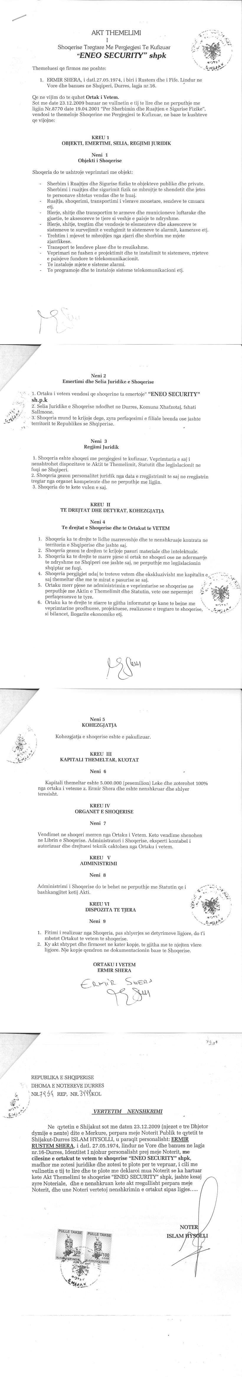 | Objekti i Veprimtarisë: | Shërbim i ruajtjes dhe sigurisë fizike të objekteve publike dhe private. Shërbim i ruajtjes dhe sigurimit fizik në mbrojtje të shëndetit dhe jetës të personave shtetas vendas dhe të huaj. Ruajtja, shoqërimi, transportimi i vlerave monetare, sendeve të çmuara, etj. Blerje, shitje dhe transportim të armëve të municioneve luftarake dhe gjuetie, të aksesorëve të tjerë si veshje e pajisje të ndryshme. Transport të lëndëve plasëse e të rrezikshme. Të instalojë mjete e sisteme alarmi, etj. |