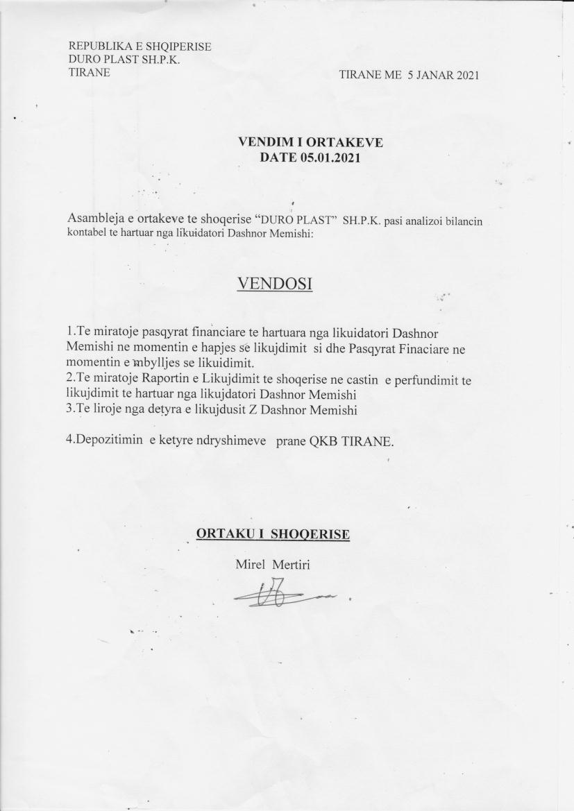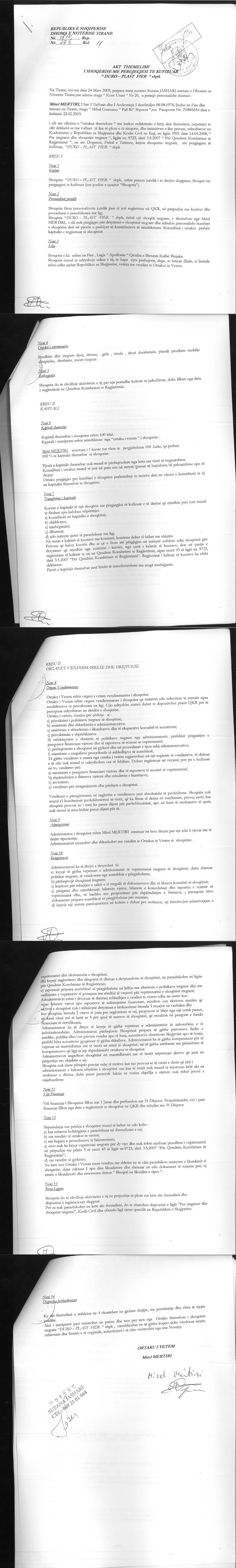 → Ekstrakt historik i regjistrit tregtar date 16.02.2022 → Akti i themelimit → Urdher per heqjen e sekuestros date 26.12.2019 → Urdher per venien e sekuestros konservative date 02.03.2017 → Vendimi i asamblese per fillimin e likuidimit te shoqerise date 30.09.2021 → Vendimi per miratimin e raportit te likuidimit date 05.01.2021 |