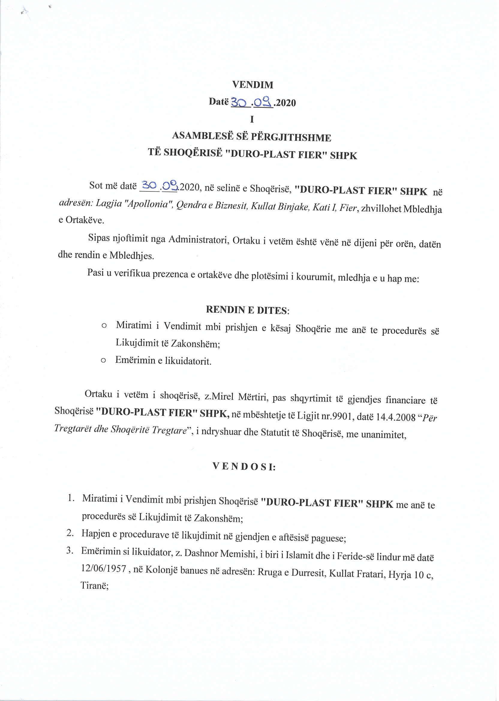 | Çështje Ligjore: | I. Me date 10.07.2013, me ane te Urdherit Nr.2057, Nr.8870 Prot, lëshuar nga Shoqëria Përmbarimore “STRATI BAILIFF'S SERVICE” sh.p.k, u urdherua vendosja e masës së sekuestros konservative mbi aktivet e debitorit shoqëria “DURO - PLAST FIER” sh.p.k me NUIS( NIPT)- K92725401R me perfaqesues ligjor Mirel Mertiri. Keto aktive do të qëndrojnë të bllokuara deri në një urdhër të dytë. II. Me date 02.03.2017, me ane te Urdhërit Nr.120 Prot, protokolluar nga QKB me Nr. 23467 Prot., date 08.03.2017 "Për Vënien e Sekuestros Konservative”, lëshuar nga Permbarues Privat "Ergys Sinani", drejtuar QKB, u urdherua QKB te beje bllokimin e kuotave/aksioneve/aktiveve apo çdo te drejte tjeter ne subjektet tregtare qe zoterohen dhe jane regjistruar ne emer te Debitorit DURO-PLAST FIER, NIPT K92725401R III. Me date 26.12.2019, me ane te Urdhrit nr. 1143Prot., nr.1 Dosje, lëshuar nga Përmbaruesi Gjyqësor Privat Ergys Sinani, protokolluar nga QKB me nr. 94 Prot., date 08.01.2020, u urdherua heqja e masës së sekuestros të vendosur me anë të shkresës Nr.120 Prot, datë 02.03.2017 Urdhër Vëndosjen e Sekuestros Konservative të kuotave/aksioneve/aktiveve apo çdo të drejte tjetër në subjektet tregtare që zotërohen dhe janë të regjistruara në emër të debitorit Mirel Mërtiri në subjektin “DURO-PLAST FIER”SHPK, NIPT K92725401R”. IV. Me date 30.09.2020, me vendim te ortakut te vetem, u kalua shoqeria ne likuidim. U caktua si likuidues i shoqerise Dashnor Memishi. Statusi ndryshon nga “Aktiv” ne “Shoqeri ne Likuidim e Siper”. V. Me date 05.01.2021, me vendim te ortakut te vetem, u miratua raporti i likuidimit te shoqerise. Statusi i shoqerise behet i “C’regjistruar”. |