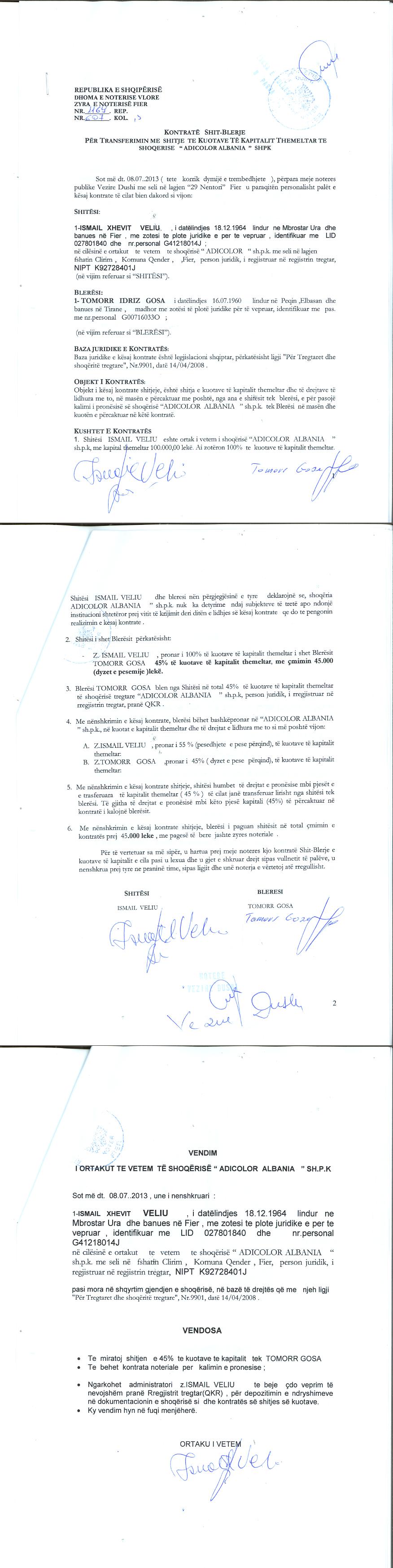 → Ekstrakt Historik i Regjistrit Tregtar date 23.02.2023 → Akt themelimi dhe Statuti i Shoqerise → Kontrate Shitblerje Kuotash date 08.07.2013 → Kontrate Dhurimi Kuotash date 18.03.2022 |