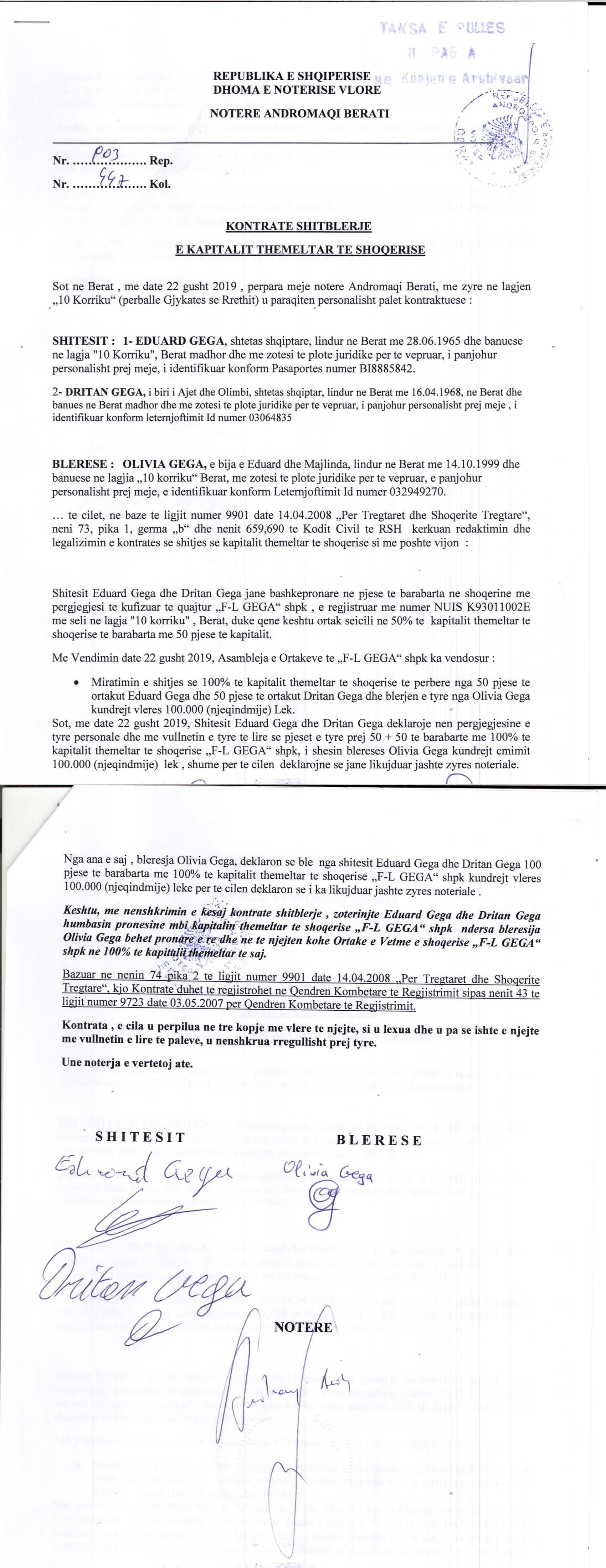 → Ekstrakt historik i regjistrit tregtar 07.02.2022 → Akti i themelimit → Kontrate shitblerje e kapitalit 22.08.2019 |