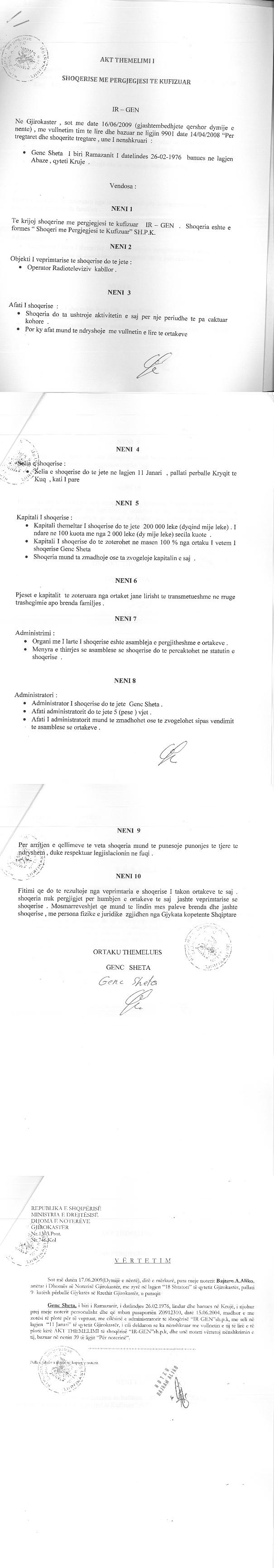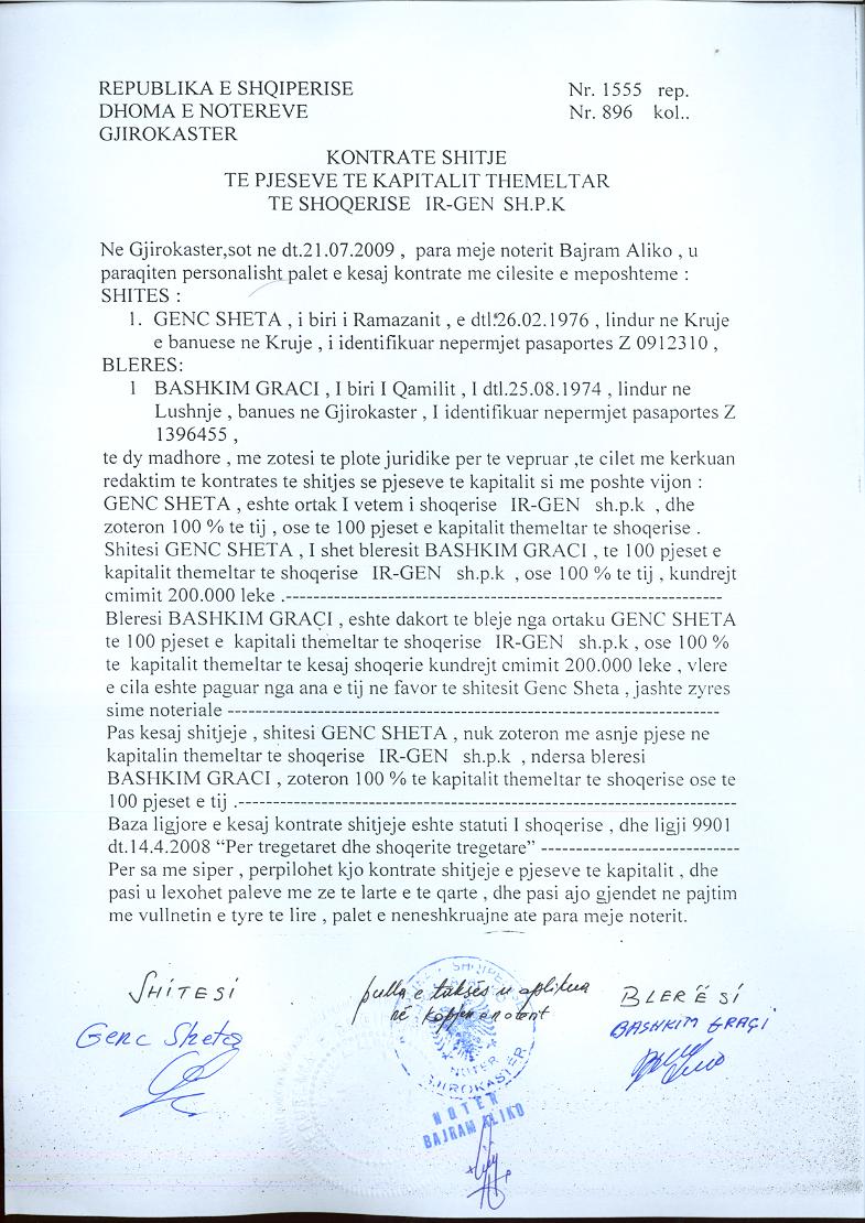 → Ekstrakti Historik i Regjistrit Tregtar date 14.01.2023 → Akt themelimi i Shoqerise → Kontrate Shitje Kuotash date 21.07.2009 |