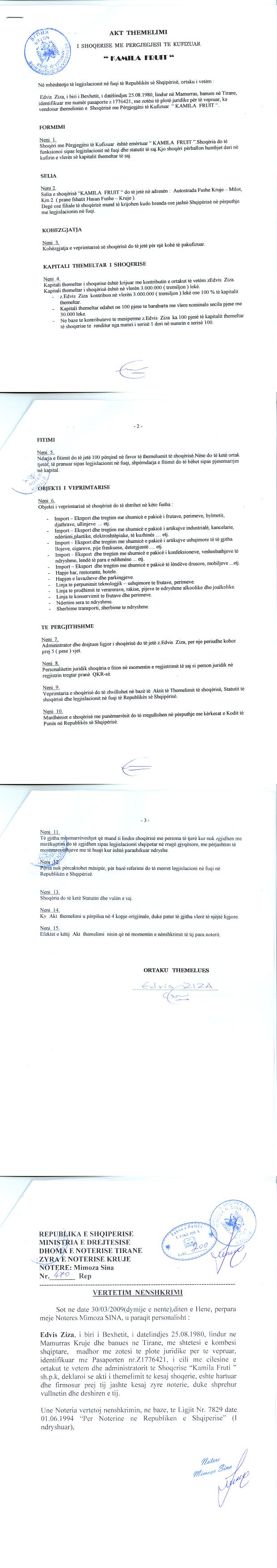 → Ekstrakt Historik i Regjistrit Tregtar date 13.10.2023 → Akt themelimi i Shoqerise → Kontratë Shitje Kuotash datë 13.11.2017 → Vendim i Asamblesë së Ortakëve, Zmadhim Kapitali datë 10.02.2018 → Ekstrakt Historik i Regjistrit Tregtar date 17.04.2024 → Të dhënat e Investimit, Financimet Nga IPARD - Aksesuar nga Agjencia për Zhvillim Bujqësor dhe Rural AZHBR datë 17.04.2024 |