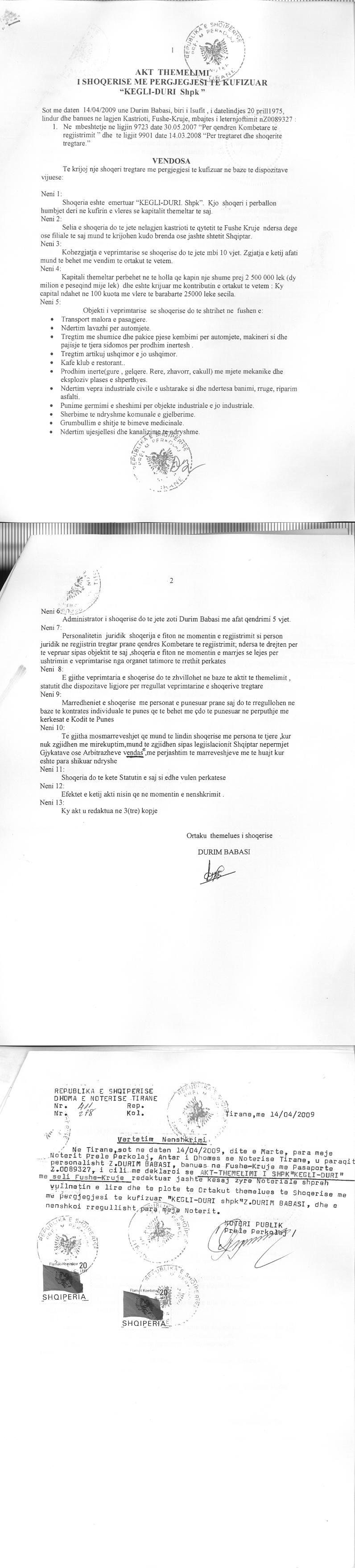 | Çështje Ligjore: | I. Me date 27.10.2016, me ane te Urdherit Nr. 21300 Prot, lëshuar nga shoqeria permbarimore ZIG shpk , protokolluar nga QKB me Nr.9048 Prot., datë 31.10.2016, u urdherua vendosja e masës së sekuestros konservative mbi kuotat qe pala debitore Durim Babasi zoteron si perfaqesues i subjektit "KEGLI-DURI “shpk me NIPT-K94016202U. II. Me date 23.01.2017, me ane te Urdhërit Nr.00742Prot "Për Heqjen e Sekuestros Konservative”, lëshuar nga Shoqëria Përmbarimore"Sherbimi Permbarimor ZIG", drejtuar QKB, u urdherua heqja e masës sekuestro konservative te vendosur me ane te shkreses Nr.21300 Prot., date 27.10.2016 ne pjeset/kuotat qe debitori Durim Isuf Babasi zoteron si perfaqesues i subjektit "KEGLIDURI" Shpk me NIPT K94016202U. |
