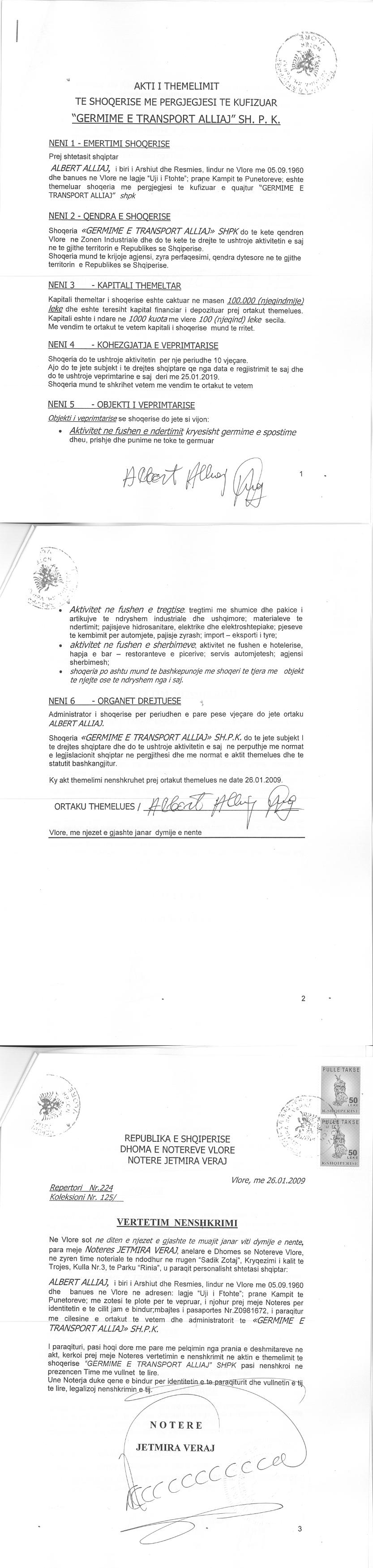 | Objekti i Veprimtarisë: | Aktivitet në fushën e ndërtimit kryesisht gërmime e spostime dheu, prishje dhe punime në tokë të gërmuar. Aktivitete në fushën e tregtisë: tregtimi me shumicë e pakicë i artikujve të ndryshëm industriale dhe ushqimore, materialeve të ndërtimit, pajisjeve hidrosaniare, elektrike dhe elektroshtëpiake, pjesëve të këmbimit për automjete, pajisje zyrash, import-eksport i tyre. Aktivitete në fushën e shërbimeve, hoteleri, turizëm, hapje baresh e restorantesh, servis automjetesh, agjensi etj. Studim, projektim, dizajne brenda dhe jashte vendit. Studim, projektim, dizajne brenda dhe jashte vendit. |