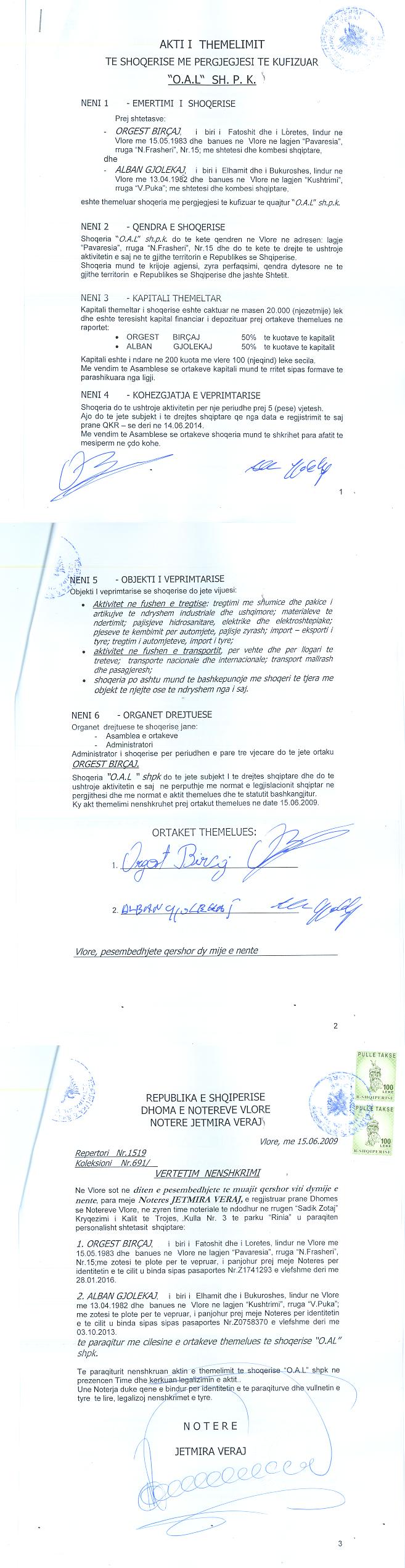 → Ekstrakt historik i regjistrit tregtar date 03.08.2021 → Akti i themelimit |