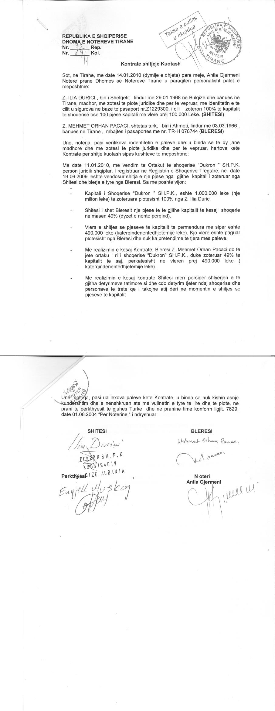 → Ekstrakti Historik i Regjistrit Tregtar date 23.08.2024 → Statuti i Shoqerise → Kontrate e shitjes se kuotave date 14.01.2010 |