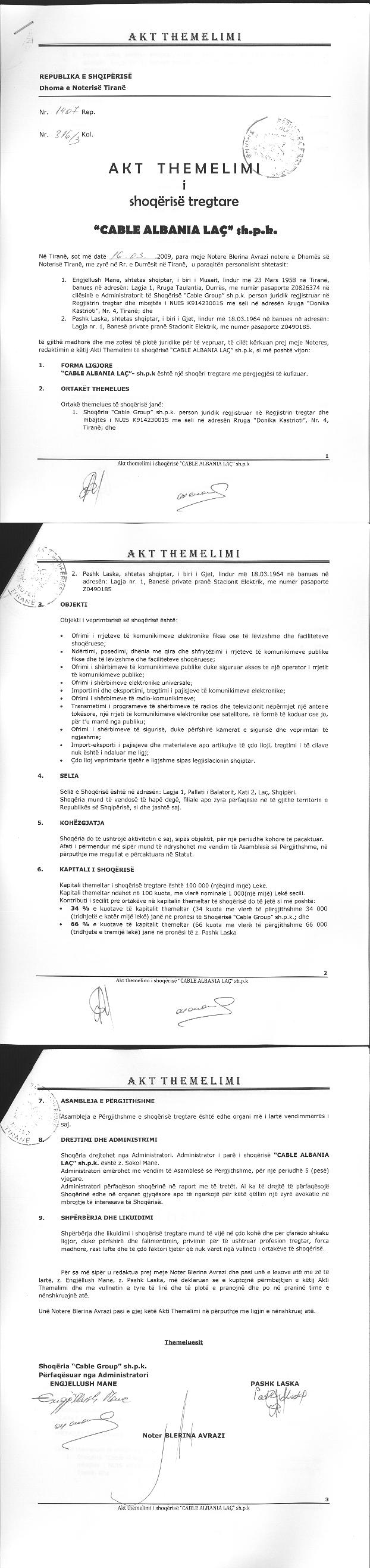 | Shoqëri Mëmë / Zotërues për këtë Subjekt: | “CABLE GROUP", shoqëri aksionare, e themeluar më datë 18/02/2009, sipas ligjeve të Republikës së Shqipërisë, me numër identifikimi në regjistrin tregtar NIPT K91423001S, me adresë aktuale në Tirane Rruga Donika Kastrioti, nr. 4, dhe me administrator Engjëllush Mane. Ortak i vetëm i shoqërisë është Engjëllush Mane, zotërues për 100% të kapitalit. (Sipas të dhënave të QKB deri më datë 15.03.2025) Subjekti Juridik nuk ka regjistruar të dhëna në regjistrin e pronarëve përfitues RPP deri më datë 15.03.2025 |