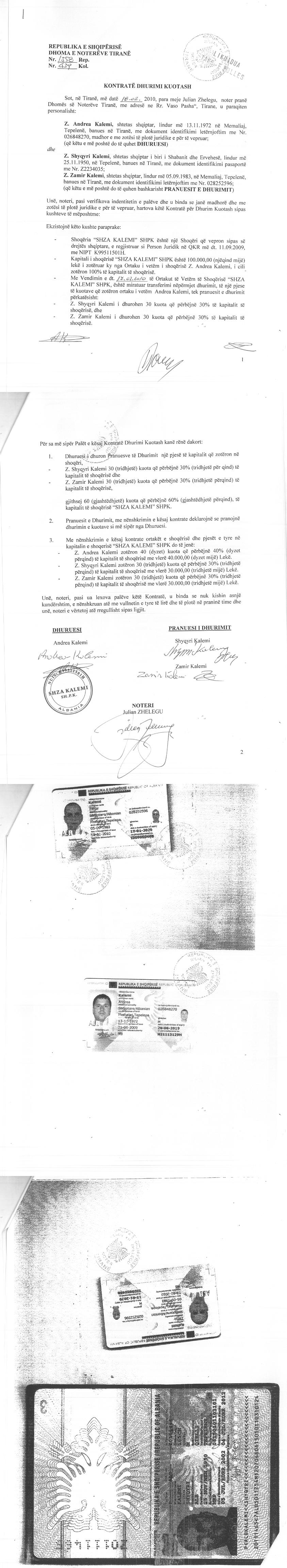→ Ekstrakt historik i regjistrit tregtar date 31.08.2021 → Akti i themelimit → Kontrate dhurimi kuotash date 18.02.2010 → Ekstrakt Historik i Regjistrit Tregtar date 10.08.2023 |
