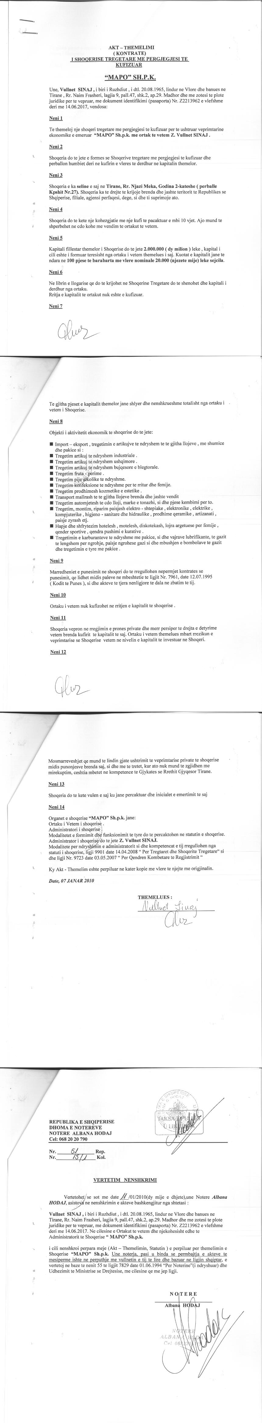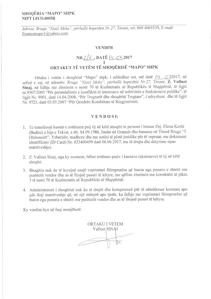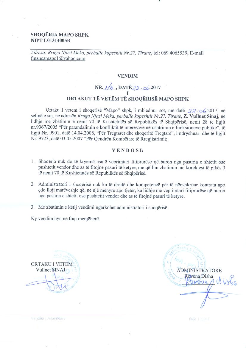 | Shënime: | Kompetencat e Administratorit: Administratori i shoqerise nuk ka te drejte dhe kompetence per te nenshkruar kontrata apo cdo lloji mareveshje qe, ne nje menyre apo tjeter, ka lidhje me veprimtari fitimprurese qe buron nga pasuria e shtetit ose pushtetit vendor dhe as te fitojne pasuri te ketyre. |