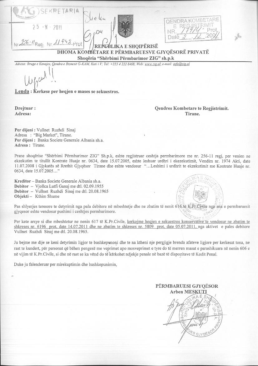 256-11 Regj, Nr. 5809 Prot., te shoqerise "Sherbimi Permbarimor ZIG"