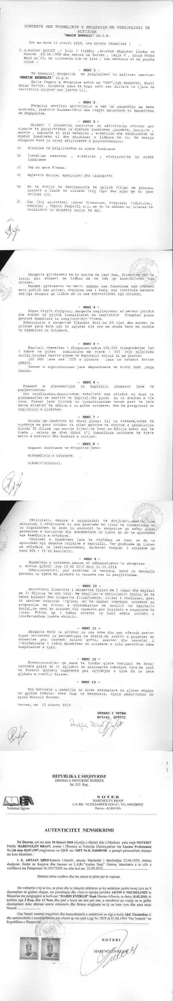 → Ekstrakt Historik i Regjistrit Tregtar date 23.02.2023 → Akt themelimi i Shoqerise → Kontrate Shitje Kuotash date 27.11.2013 → Kontrate Dhurimi Kuotash date 16.02.2019 → Vendim i Asamblese se Ortakeve, Zmadhim Kapitali date 28.07.2019 → Kontrate Dhurimi Kuotash date 29.06.2020 → Ekstrakt Historik i Regjistrit Tregtar date 18.05.2023 → Ekstrakt historik i regjistrit tregtar date 30.08.2025 |