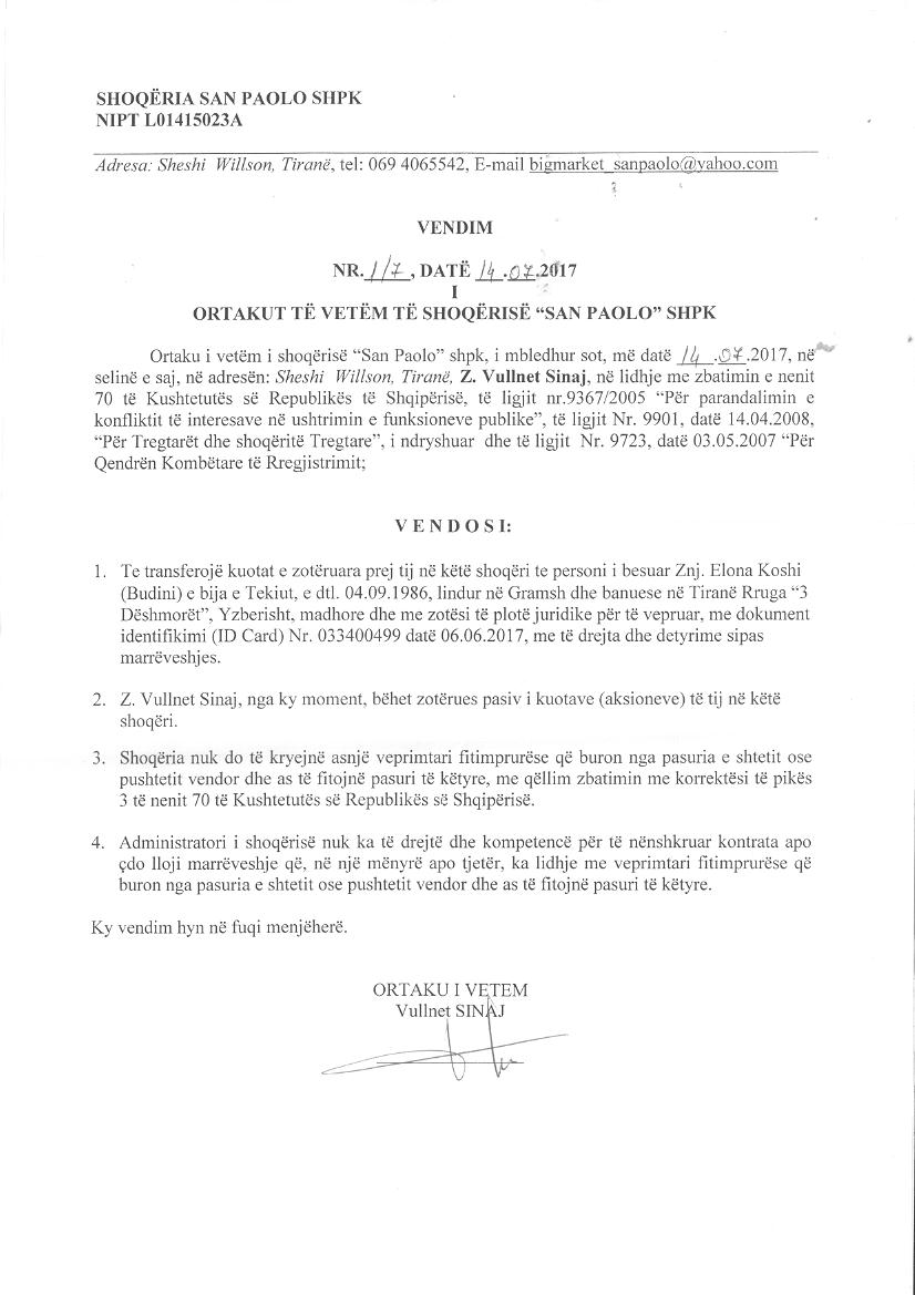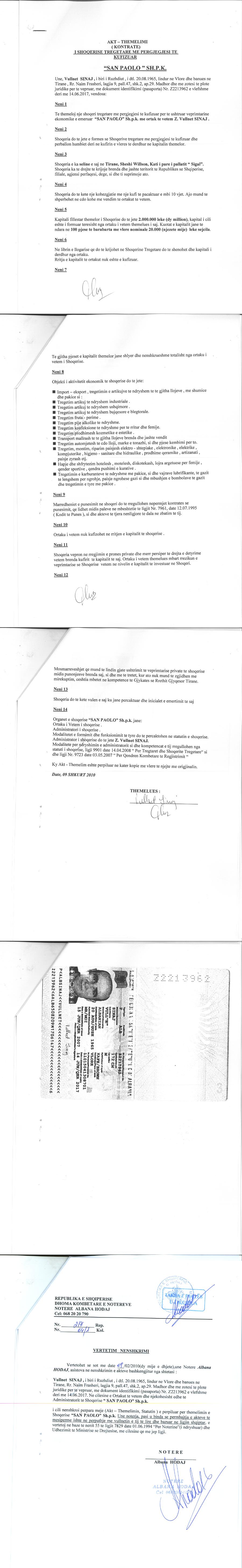 → Ekstrakt Historik i Regjistrit Tregtar date 09.08.2024 → Akt themelimi i Shoqerise → Urdhër për Vënien e Sekuestros datë 05.07.2011 → Kërkesë për Heqjen e Sekuestros datë 25.11.2011 → Vendim Nr. 1/5 i Asamblesë së Zakonshme, për moskryerjen e Veprimtarive Fitimprurëse që buron nga Pasuria e Shtetit ose Pushteti Vendor datë 09.05.2017 → Vendim Nr. 1/7 i Asamblesë së Zakonshme, Miratimi i transferimit të kuotave të Vullnet Sinaj në favor të Personit të Besuar datë 14.07.2017 → Akt-Marrëveshje Nr. 1594 Rep. Nr. 219/1 Kol., për Caktimin e Personit të Besuar datë 20.07.2017 → Akt-Marrëveshje Nr.794 Rep., Nr.85/1 Kol., për Caktimin e Personit të Besuar datë 29.03.2018 → Akt-Marrëveshje Nr.3504 Rep., Nr.293/1 Kol., për Caktimin e Personit të Besuar datë 31.10.2018 → Kontratë Shitje datë 09.05.2023 |