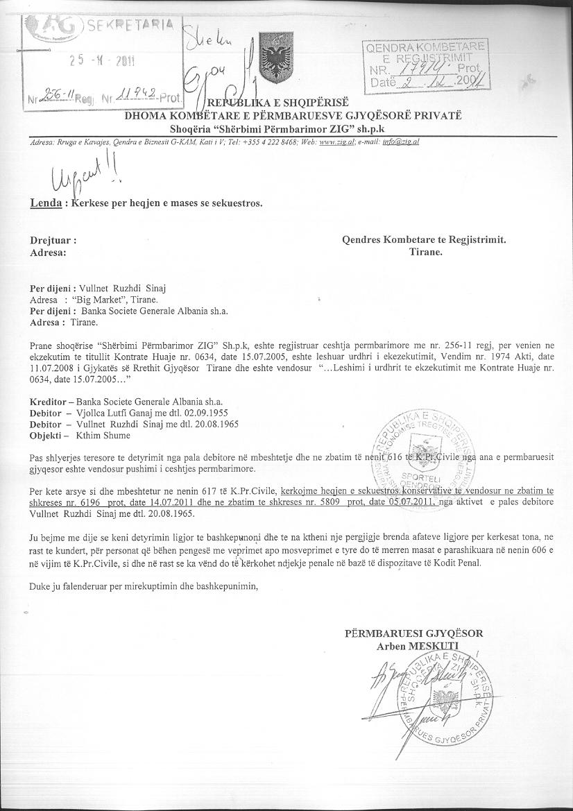 256-11 Regj, Nr. 5809 Prot., te shoqerise "Sherbimi Permbarimor ZIG"