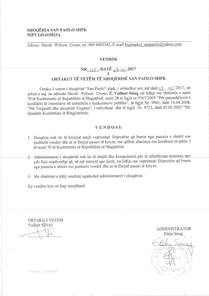 urdherese te dyte. II. Me datë 25.11.2011, me anë të kërkesës së shoqerise përmbarimore private “ZIG” sh.p.k, Nr.256-11 Regj, Nr.11924 Prot, u kërkua: heqjen e masës së sekuestros konservative të vendosur në zbatim të shkresës Nr.6196 Prot, datë 14.07.2011 dhe në zbatim të shkresës Nr.5809 Prot, datë 05.07.2011, nga aktivet e palës debitore Vullnet Rruzhdi Sinaj. III. Me datë 09.05.2017, me Vendim Nr. 1/5 të Asamblesë së Zakonshme, u vendos që Shoqeria nuk do te kryeje asnje veprimtari fitimprurese qe buron nga pasuria e shtetit ose pushteti vendor dhe as te fitoje pasuri te ketyre , me qellim zbatimin me korrektesi te pikes 3 te nenit 70 te Kushtetutes se Republikes se Shqiperise. Administratori i shoqerise nuk ka te drejte dhe kompetence per te nenshkruar kontrata apo cdo lloji mareveshje qe, ne nje menyre apo tjeter, ka lidhje me veprimtari fitimprurese qe buron nga pasuria e shtetit ose pushtetit vendor dhe as te fitoje pasuri te ketyre. |
