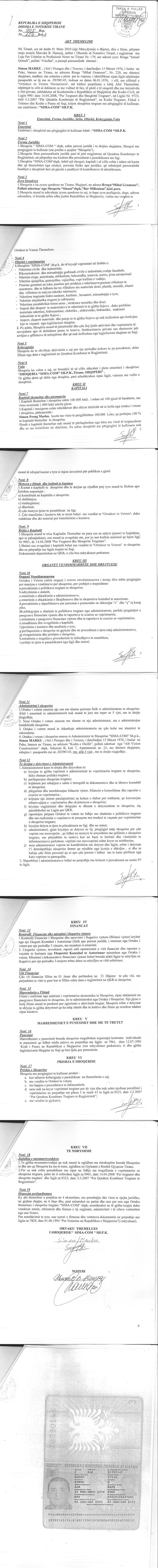 | Shënime: | Adresa Dytësore (NIPT-e sekondare) ndër vite: I. Tirane, Vore, Autostrada Tirane-Durres, Km.8, Lagjja "Berxull", Godine Private Nr.25 II. Tiranë Rruga Feizi Hizmo, Unaza e Re, Zona Kadastrale 3866, Nr.Pasurue 306/378 III. Lezhe, Shengjin, Lagjja Kune, rruga "Fran Ivanaj", Zona Kadastrale 1987, Nr.Pasurie 3/647-N2 IV. Tirane, Rruga " Mihal Grameno", ("Dalip Zavalani"), Nj. Strukturore TR/ 84, Tirane V. Lezhe, Shengjin, Lagjja Kune, rruga "Fran Ivanaj", Zona Kadastrale 1987, Nr.Pasurie 3/647-N2 |