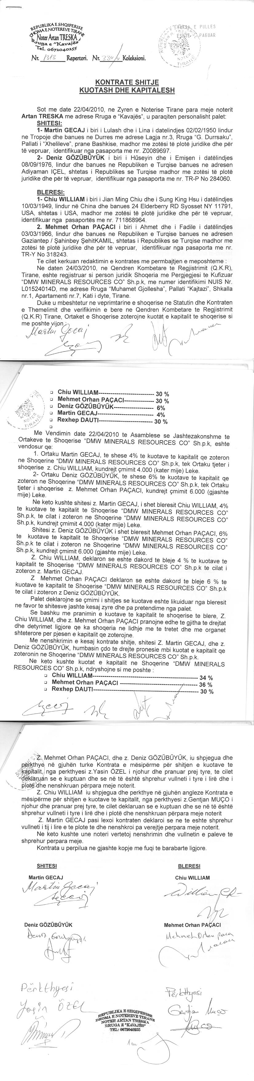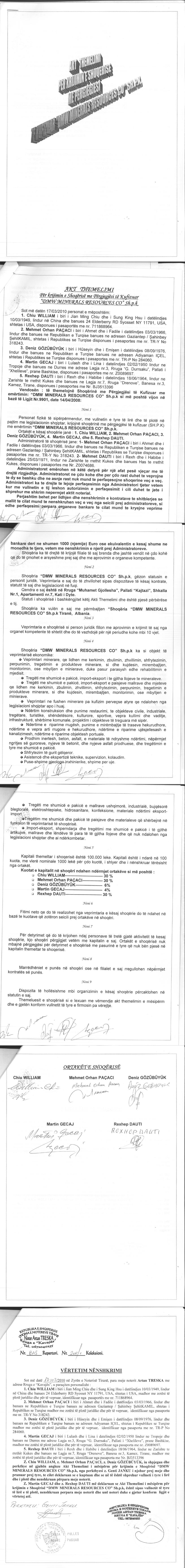 | Çështje Ligjore: | I.Sipas vendimit te Asamblese se Jashtezakonshme te ortakeve date 10.08.2010, eshte ndryshuar statusi i shoqerise nga "Aktiv" ne "Shoqeri ne Likuidim e Siper". II.Me date 08.07.2016, me ane te urdhrit, Nr.1867 Prot, Nr. 906/1 Dosje, protokolluar nga QKB, me Nr.4105 Prot, date: 12.07.2016, lëshuar nga studio permbarimore “TDR GROUP”, eshte urdheruar: Vendosja e mases se sekuestros konservative mbi te gjitha aksionet e zoteruara nga z. Rexhep Dauti, ne shoqerine “DMW MINERALS RECOURSES CO”, me NUISL01524014D. III.Me date 21.01.2019, me ane te Vendimit “Per Pushimin e Ekzekutimit” të Shoqerise Permbarimore Private “TDR Group”, me Nr.108 Prot., Nr.906/1 Dosje, është vendosur: Pushimi i ekzekutimit te Urdhrit te Ekzekutimit Nr.7050Akti, te leshuar ne date 24.12.2004 prej Gjykates se Rrethit Gjyqesor Tirane. Zhbllokimin nga masa e sekuestros konservative menjehere aksionet e zoteruara nga Z.Rexhep Dauti, bllokuar me ane te shkreses Nr.1867 Prot., date 08.07.2016 te shoqerise permbarimore “TDR Group”. |