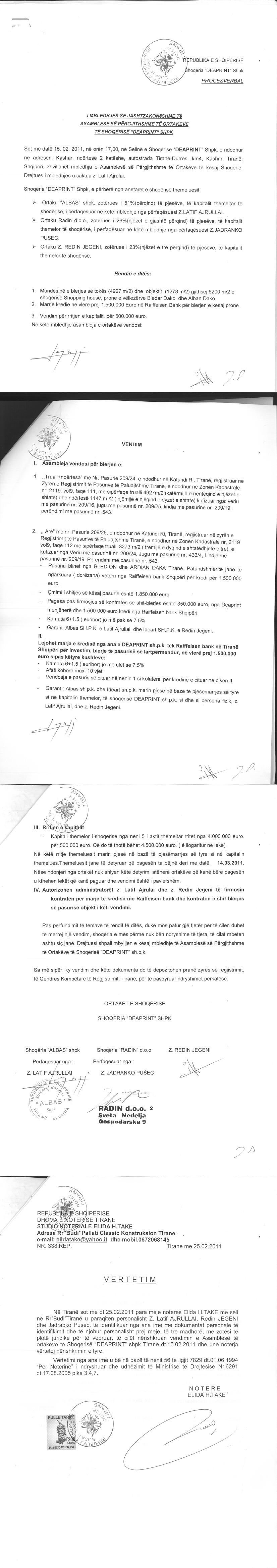 | Çështje Ligjore: | Me date 15.02.2011, me ane te mbledhjes se jashtezakonshme te asamblese se ortakeve, lejohet marrja e kredise nga ana e DEA PRINT shpk tek Raiffeisen Bank ne Tirane, per investim, blerje te pasurise se lartpermendur, ne vlere prej 1.500.000 (nje milion e peseqind mije) euro. |