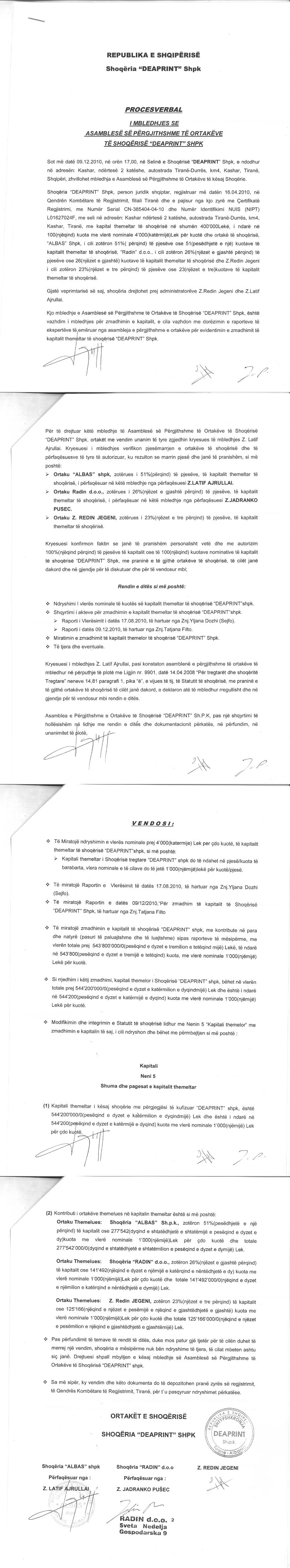 → Ekstrakt historik i regjistrit tregtar date 28.01.2022 → Akti i themelimit → Vendimi i asamblese se ortakut dhe kontrata e shitjes date 16.06.2014 → Mbledhja e asamblese se ortakeve per rritjen e kapitalit date 15.02.2011 → Procesverbal i mbledhjes se asamblese se ortakeve per zmadhimin e kapitalit date 09.12.2010 |