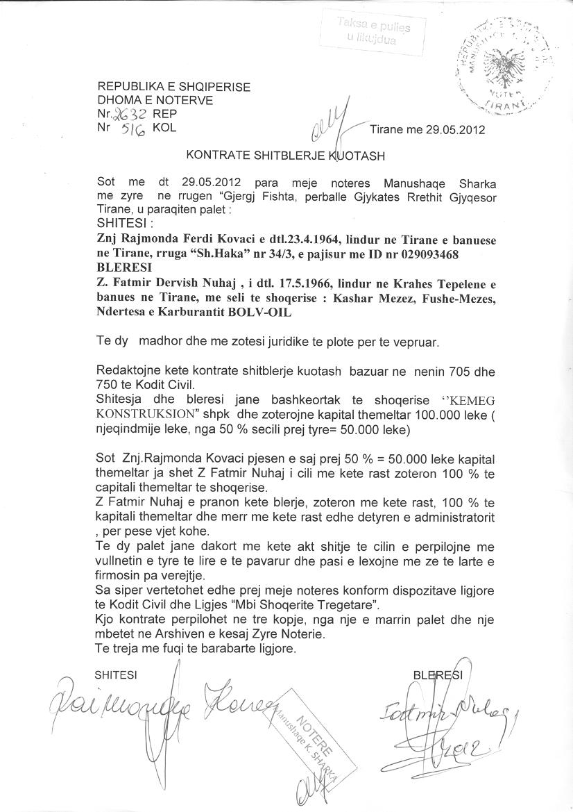 → Ekstrakt historik i regjistrit tregtar 01.03.2021 → Akti i themelimit → Kontrate shitblerje kuotash 29.05.2012 → Kontrate shitblerje kuotash 12.12.2011 → Ekstrakti Historik i Regjistrit Tregtar date 08.05.2023 |