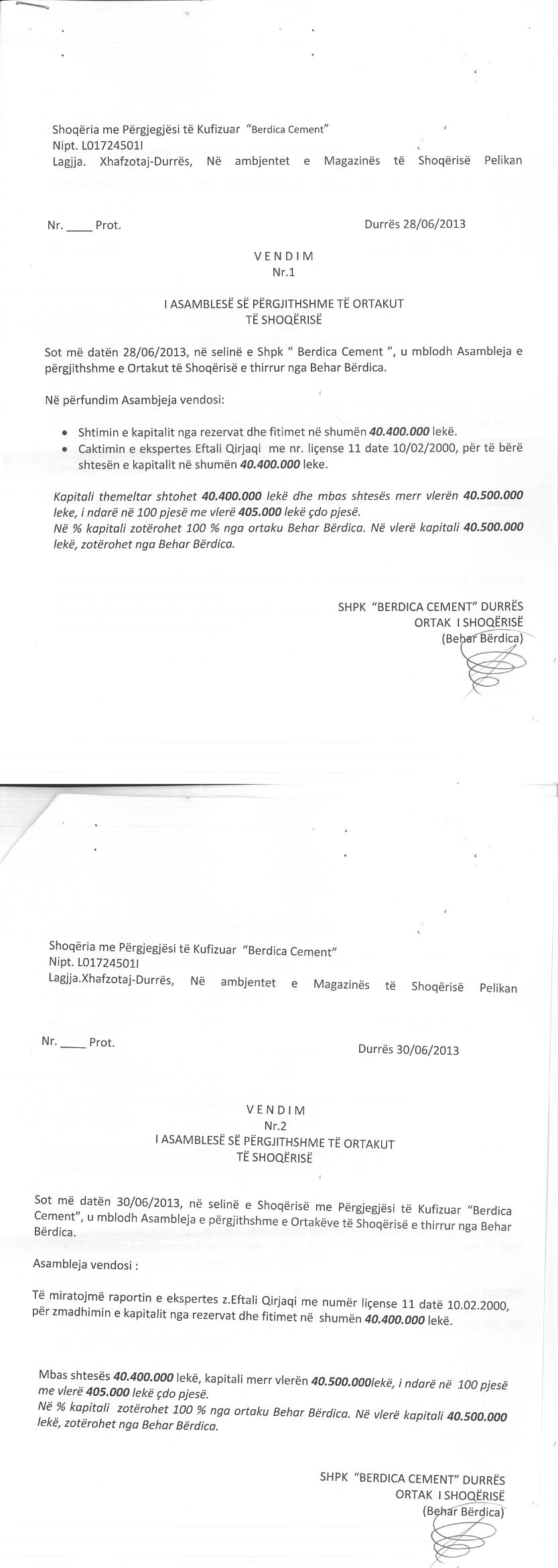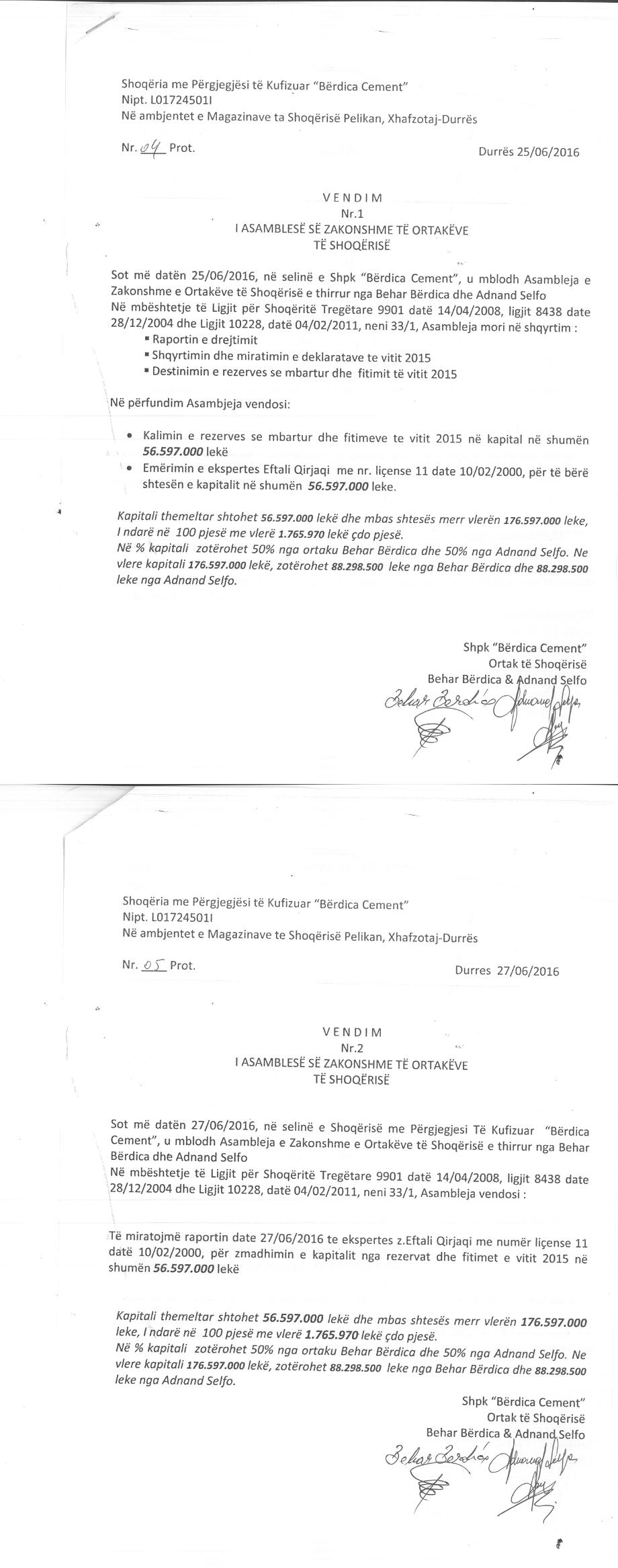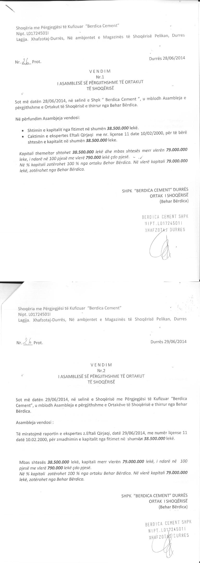 → Ekstrakti Historik I Regjistrit Tregtar date 24.06.2022 → Akt themelimi i Shoqerise → Vendim i Ortakut te Vetem, Zmadhim Kapitali date 30.06.2013 → Vendim i Ortakut te Vetem, Zmadhim Kapitali date 29.06.2014 → Vendim i Ortakut te Vetem, Zmadhim Kapitali date 18.06.2015 → Kontrate Shitje Kuotash date 19.05.2016 → Vendim i Asamblese se Ortakeve, Zmadhim Kapitali date 27.06.2016 → Vendim i Asamblese se Ortakeve, Zmadhim Kapitali date 30.06.2018 → Deshmia e Trashegimise date 15.02.2021 → Vendime te Asamblese se Ortakeve, Zvogelim Kapitali date 26.04.2021 dhe Largimi i Ortakeve date 29.04.2021 → Kontrate Shitje Kuotash date 10.02.2022 → Ekstrakt historik i regjistrit tregtar date 30.11.2023 → Marreveshje siguruese date 18.11.2022 |
