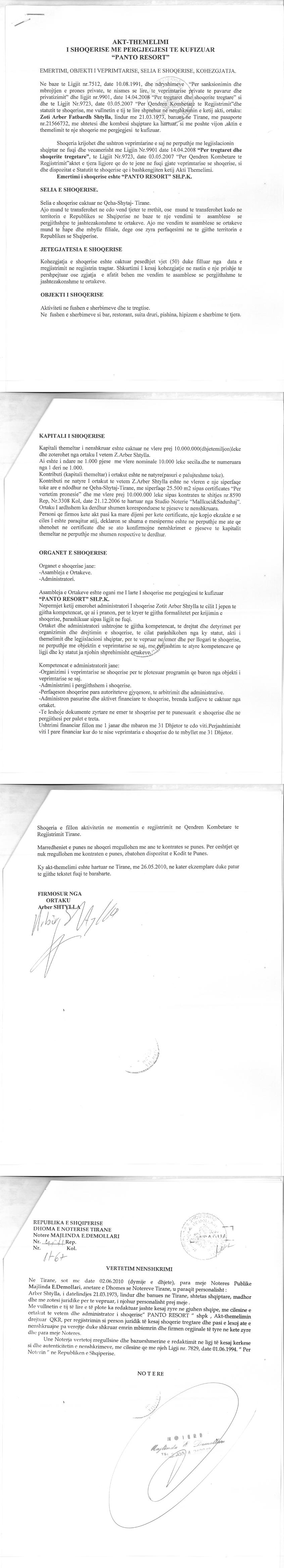 | Objekti i Veprimtarisë: | Aktivitetet ne fushen e sherbimeve dhe tregtise, si bar, restorant, suita druri, pishina, hipizem e sherbime te tjera. Investime ne ferma kuajsh me qellim turizmin rural dhe ate te natyres, gara sportive, sporte ujore etj. Aktivitetet ne fushen e sherbimeve te Agro Turizmit dhe Agro Biznesit, zhvillimin e resorteve dhe Hoteleri me 5 yje, i shtepive apo ndertesave me stil modern dhe tradicional per aktivitete turistike qe sherbejne si atraksione turistike dhe pajisjet perkatese, etj. import, eksport, prodhim, perpunim, shitje te produkteve bujqesore dhe blegtorale dhe makinerish e linjash per prodhimin e perpunimin e produkteve bujqesore e blegtorale, si dhe cdo aktivitet tjeter ne sherbim te fushave te aktivitetit te mesiperme. |