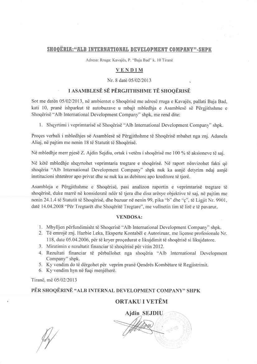 | Shënime: | Me date 05.02.2013, me vendim te ortakut te vetem, emerohet likuiduesja e shoqerise Hazbije Leka. |