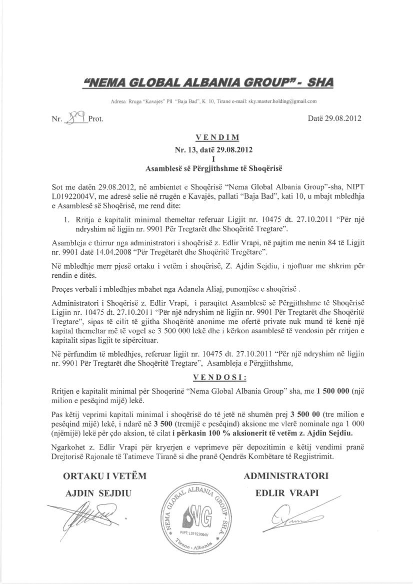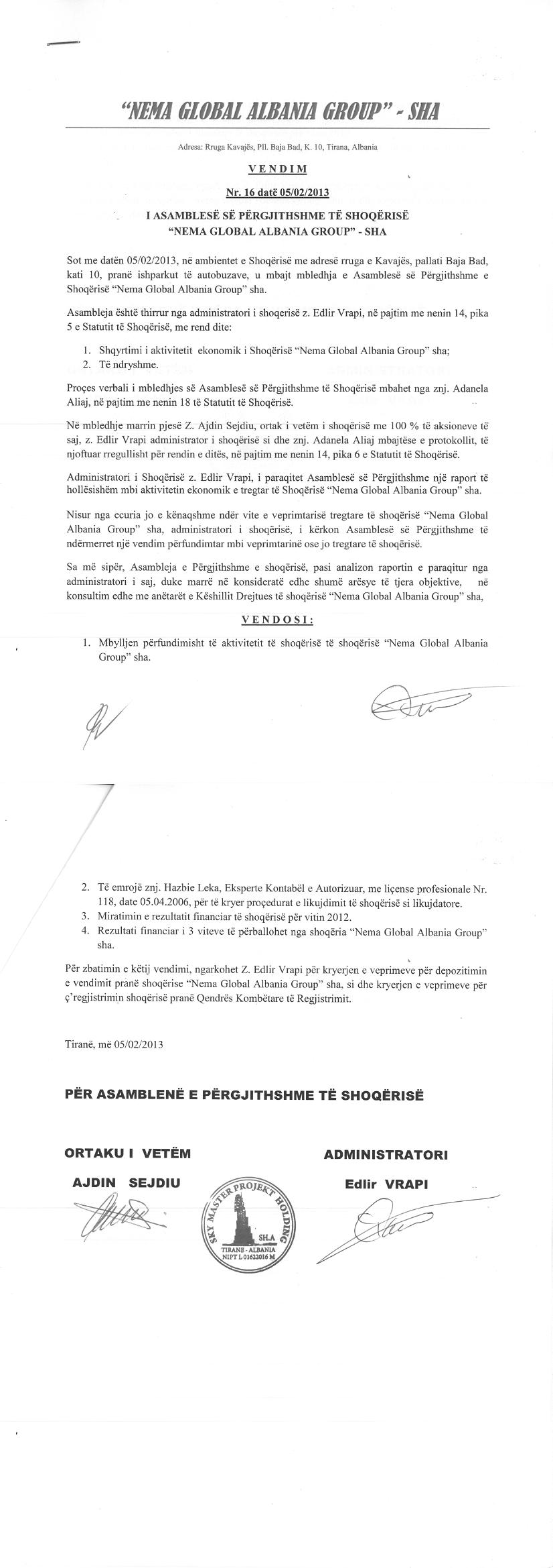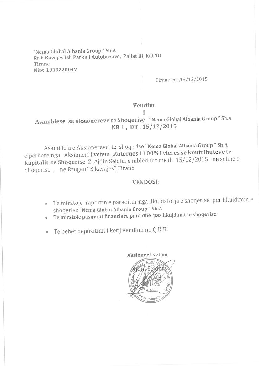 | Shënime: | Me date 05.02.2013, me vendim te aksionerit te vetem, emerohet likuiduesja e shoqerise Hazbije Leka. |